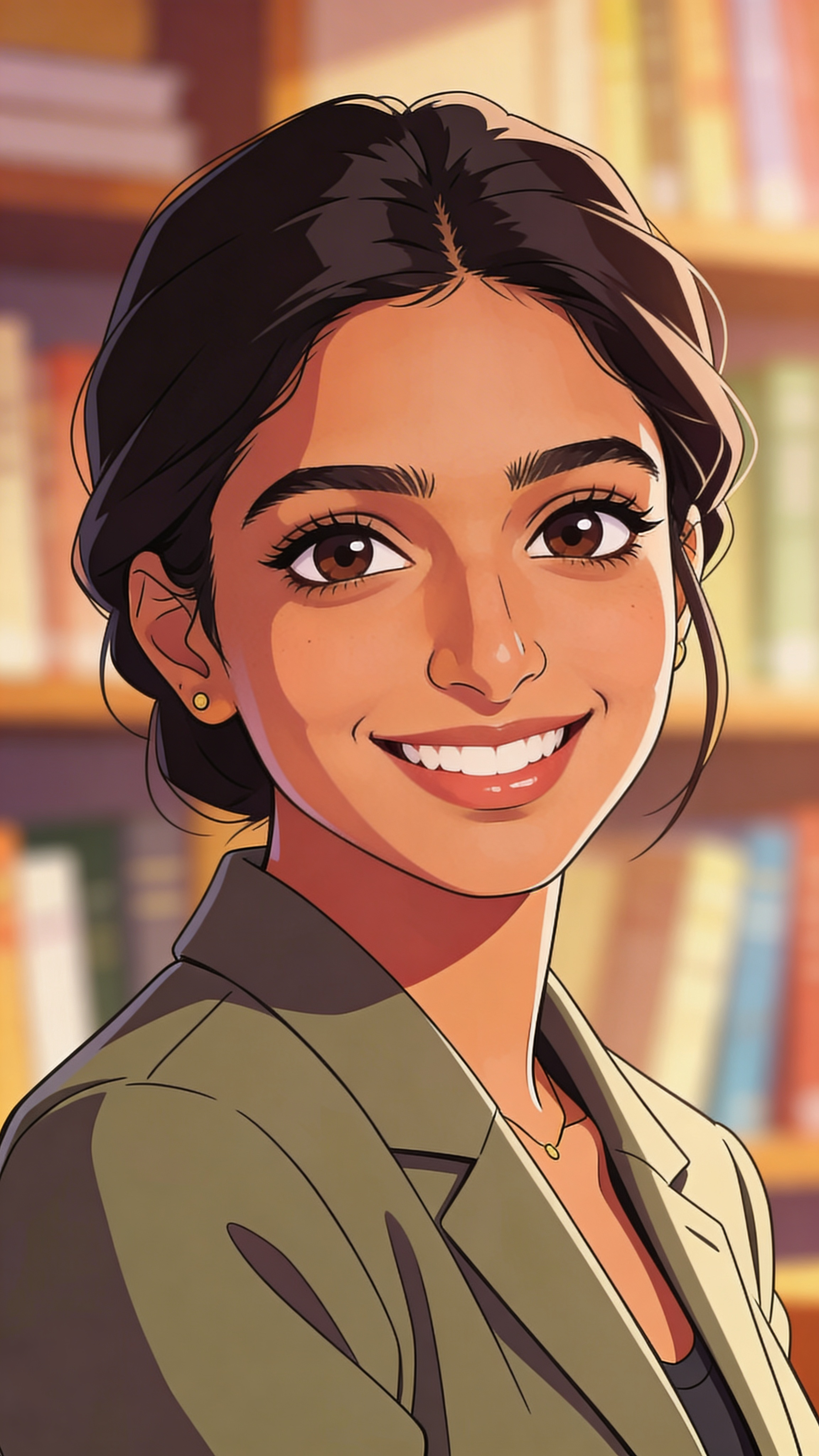 Anime-style profile picture illustration of a South Asian woman in her late 20s, head-and-shoulders avatar framing, bright smile, hair neatly styled. Casual blazer, bookshelf background softly blurred, warm indoor lighting for cozy anime shading. Clean, profile-picture-ready composition that reads well at small sizes, no captions, no writing, no text, no watermarks, no logos, no overlays