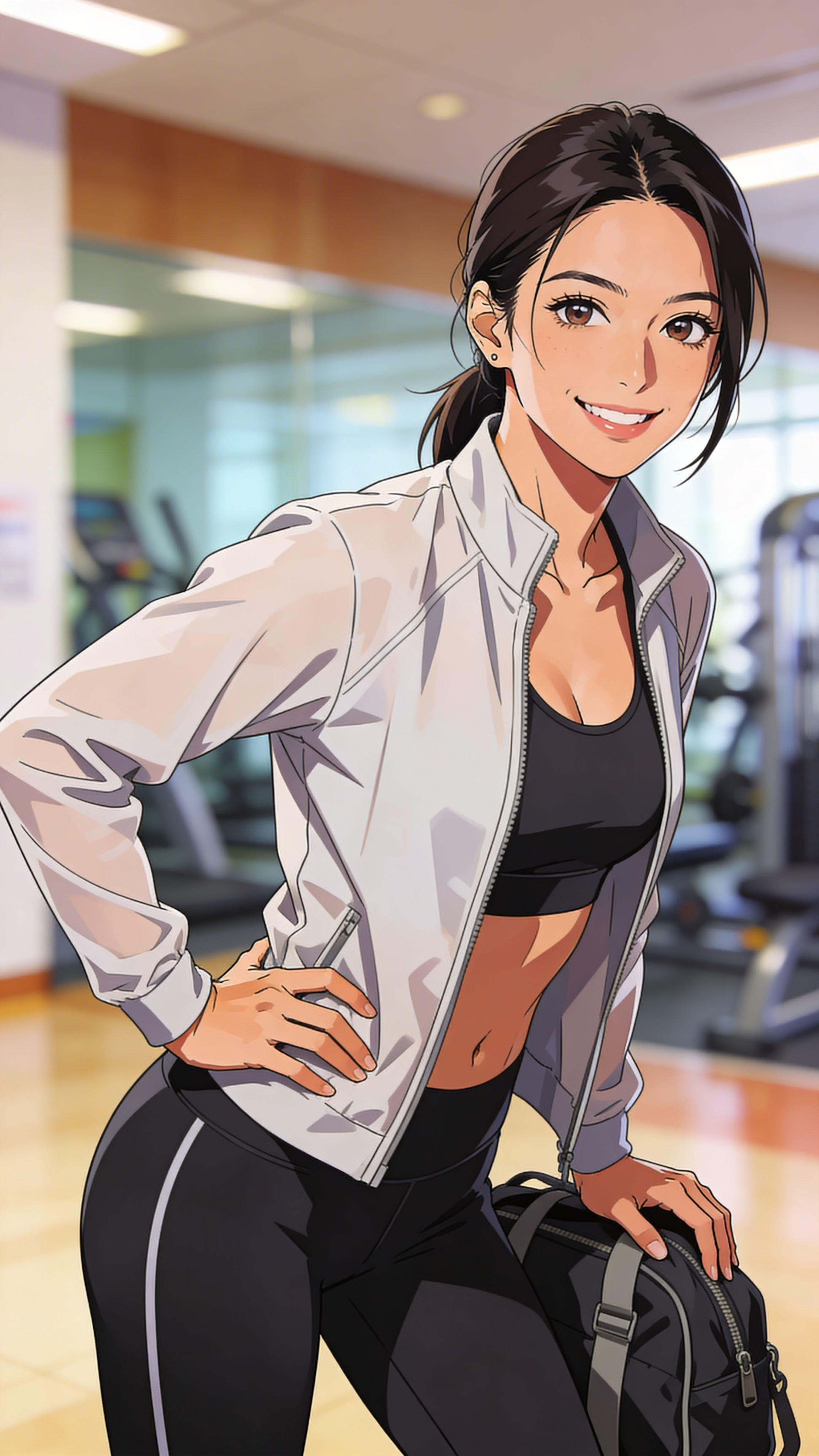 Studio-quality anime-style 3/4 body portrait illustration of a Southeast Asian woman in her early 30s in a gym lobby after a workout, relaxed smile and confident posture. Outfit: clean athletic wear and light jacket, hair neat. Lighting: bright, even indoor light, background softly blurred. The anime style should stay flattering and realistic—like “turn my photo into anime style” done right. No captions, no writing, no text, no watermarks, no logos, no overlays