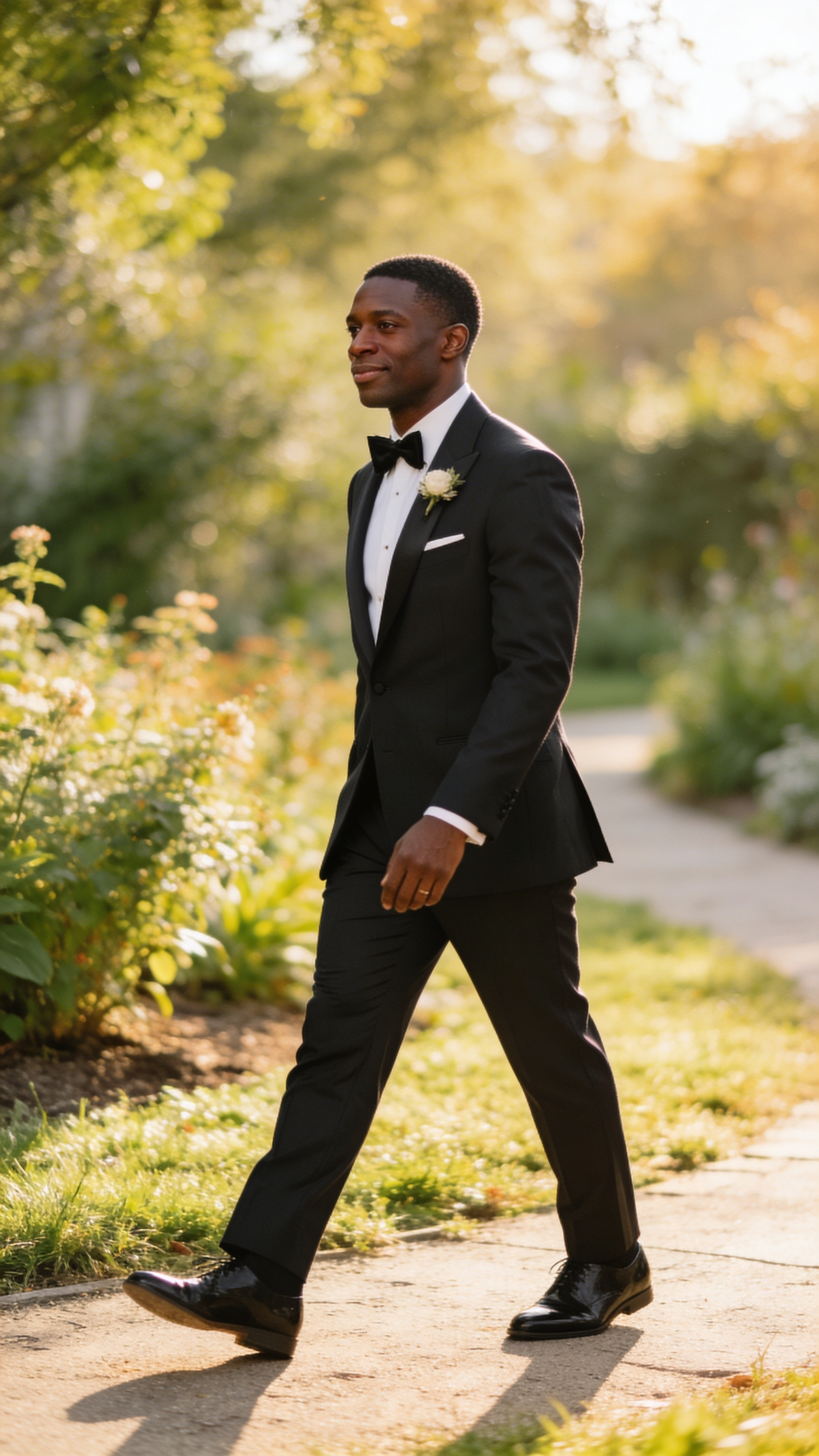 Full-body outdoor portrait of a Black/African American man in a tuxedo, walking through a garden path, relaxed confident posture. Soft morning light, greenery blurred, professional wedding groom photos look with sharp focus on face and suit. No captions, no writing; no text, no watermarks, no logos, no overlays