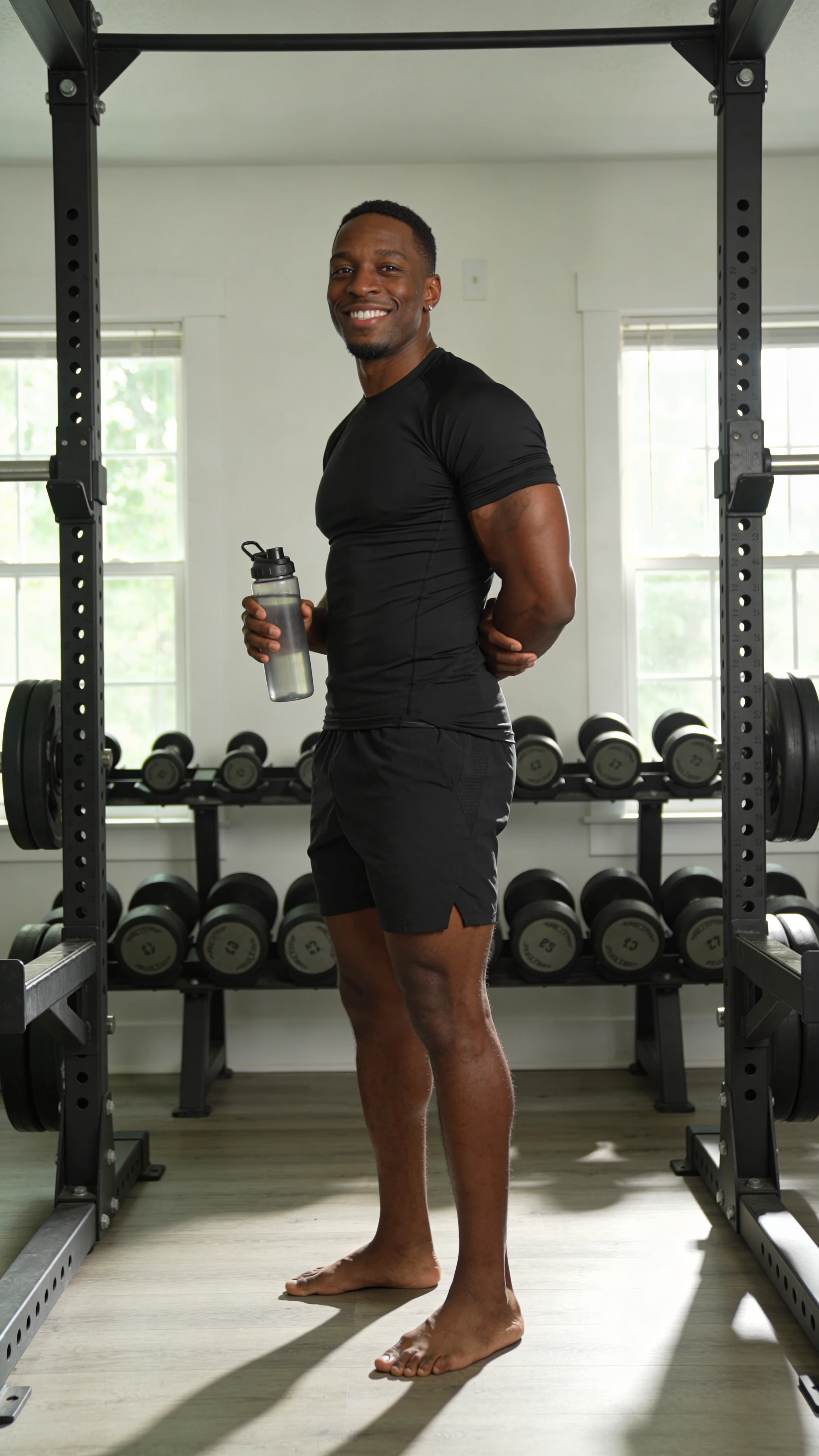 A Black/African American male bodybuilder, 3/4 body portrait in a clean home gym. Pose: relaxed stance holding a plain water bottle, friendly grin, shoulders back. Clothing: simple black shorts, unbranded compression top rolled to show arms. Lighting: soft window light plus a small fill light for realistic shadows. Background: neat weights, no logos. No captions, no writing; no text, no watermarks, no logos, no overlays
