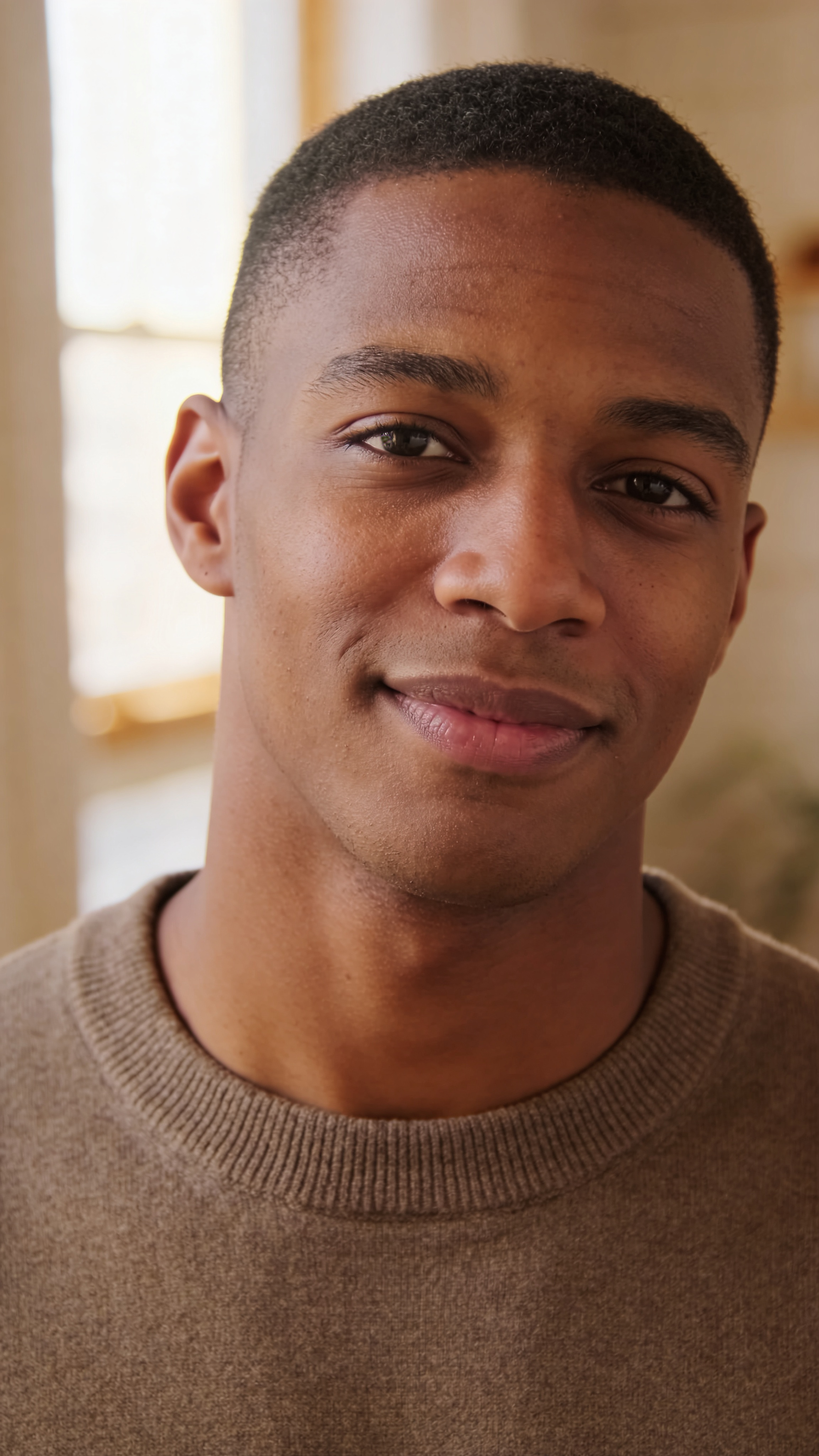 Professional headshot of a Black/African American man in his late 20s in soft window light, wearing a simple sweater. He has a neat haircut, subtle smile, calm eye contact. Background is a clean indoor setting blurred out; natural skin texture, minimal retouching, authentic dating profile headshot. no text, no watermarks, no logos, no overlays, no captions, no writing. no text, no watermarks, no logos, no overlays