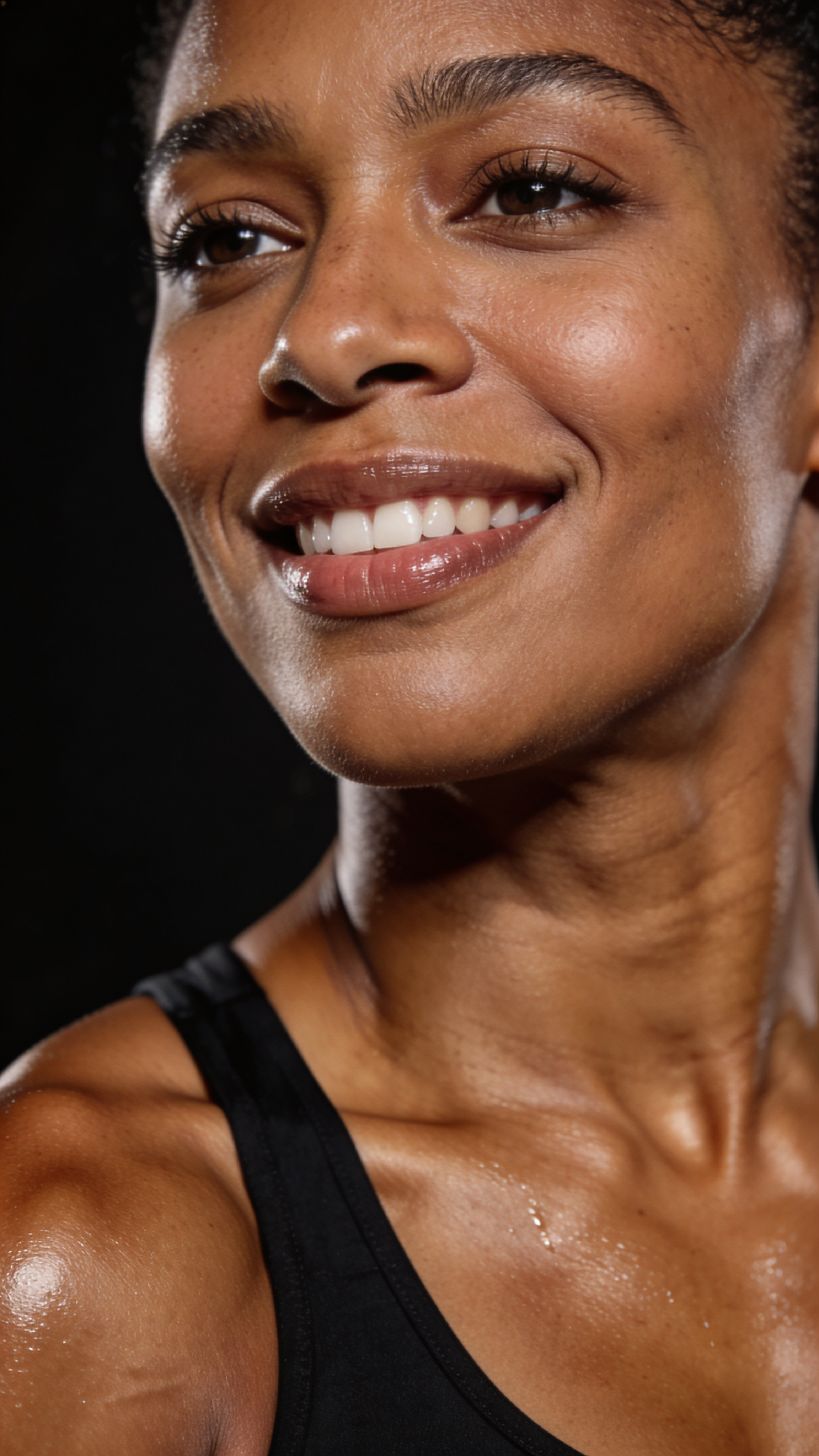 Studio close portrait of a Black/African American woman bodybuilder, mid 30s, showing face and upper torso with defined shoulders, subtle sheen, confident smile. Outfit: simple black sports bra. Lighting: beauty dish key light with soft rim, clean skin detail, professional retouching. Designed for AI female bodybuilder photos generator results, no captions, no writing, no text, no watermarks, no logos, no overlays