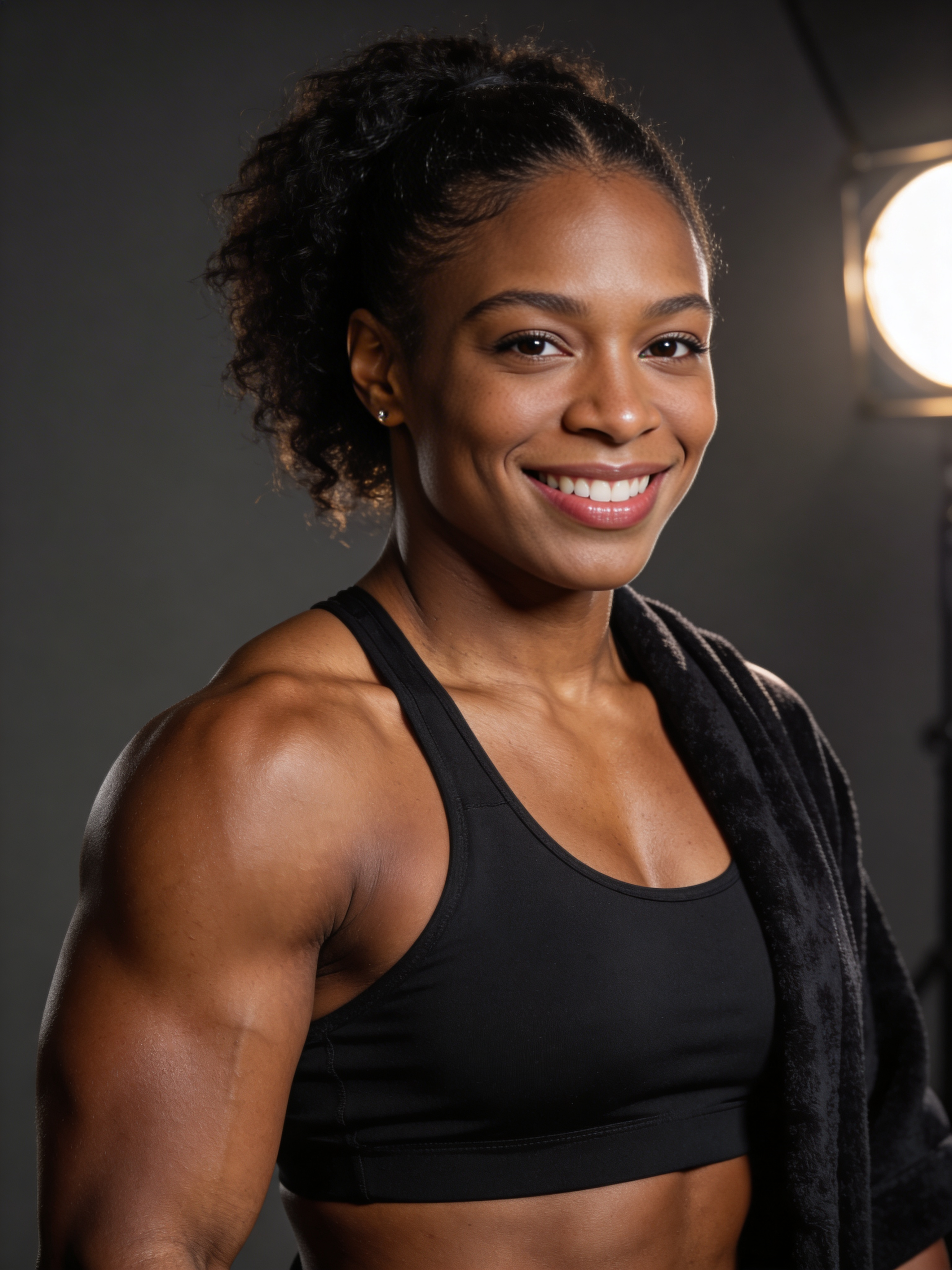 Professional studio portrait of a Black/African American woman bodybuilder, half-body, confident smile, wearing a simple black sports bra and robe draped over shoulder. Neutral dark backdrop with softbox key and rim light to define shoulders. Clean, high-end bodybuilding portrait aesthetic, no text, no watermarks, no logos, no overlays