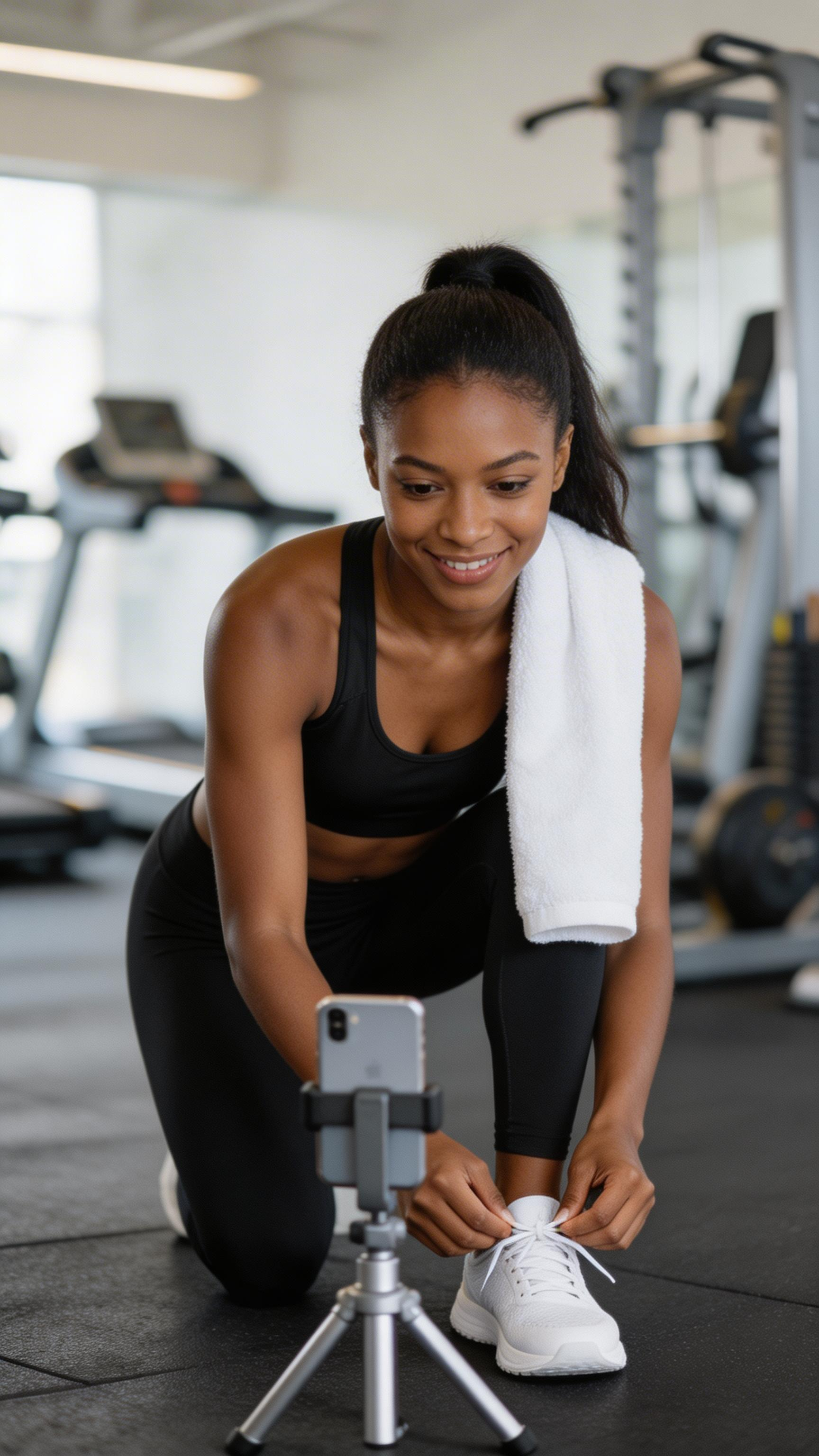 Environmental portrait of a Black/African American woman in her early-30s filming a “mini vlog” in a gym corner, phone on tripod capturing her as she ties her shoes. Outfit: athletic set, towel over shoulder. Expression: motivated, real. Background: gym equipment softly blurred, clean high-contrast lighting. no captions, no writing, no text, no watermarks, no logos, no overlays
