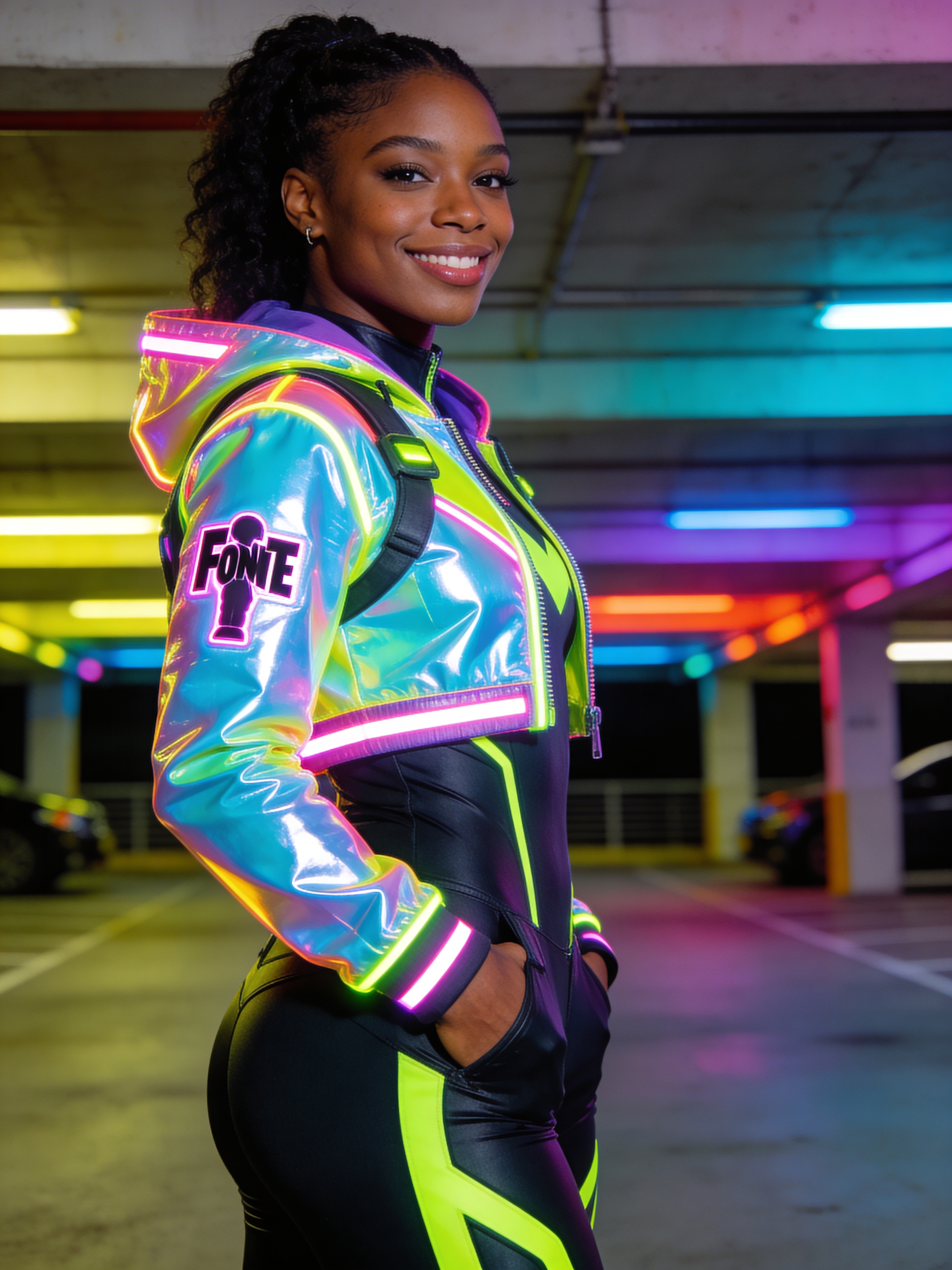 Three-quarter body portrait of a Black/African American woman in her 20s wearing a Fortnite-inspired neon cyber cosplay jacket with reflective accents and sleek leggings. She stands in a clean parking-garage set with colored lights, hands in pockets, confident smirk. Cinematic lighting with strong rim highlights, high-contrast professional photo style, shallow depth of field. No captions, no writing, no text, no watermarks, no logos, no overlays