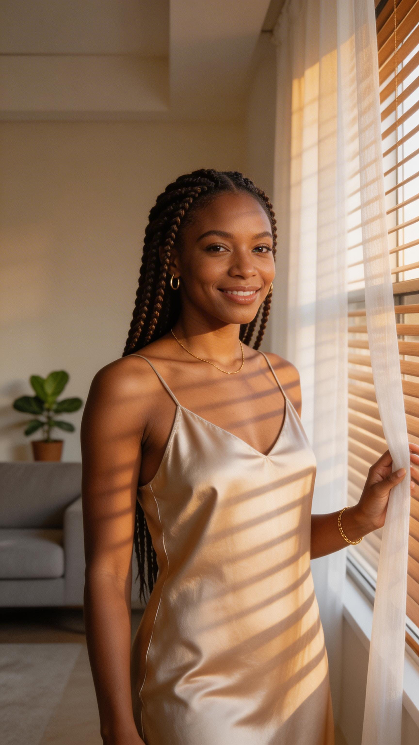 Adult Black/African American woman with braided hair, athletic-slim build, wearing a satin slip and delicate jewelry. Standing pose in a modern living room, one hand lightly touching a curtain, friendly confident expression. Golden hour light through blinds creates soft patterns, professional lifestyle portrait. Clean composition, no captions or writing. no text, no watermarks, no logos, no overlays