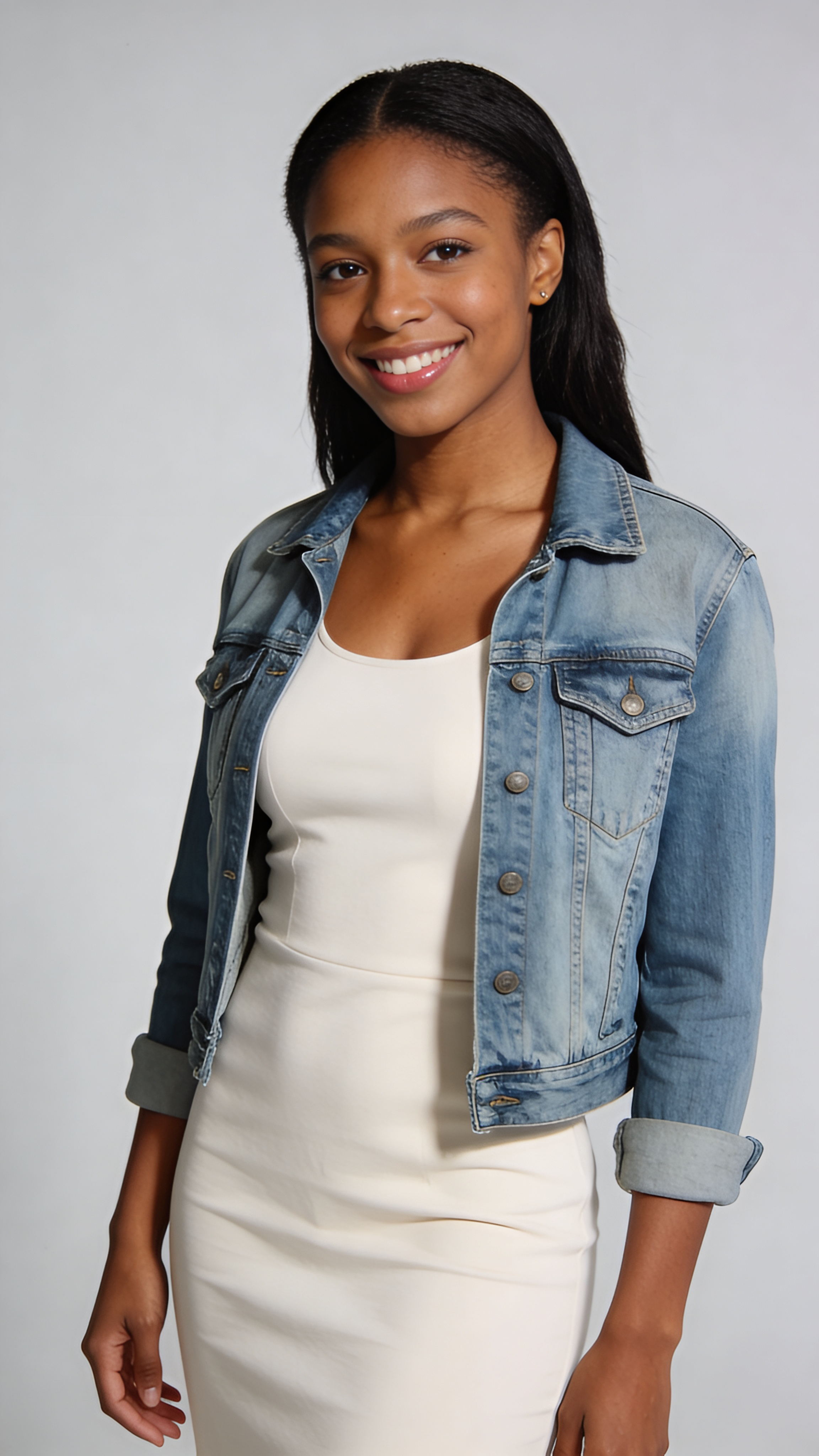 Professional 3/4 body portrait of a Black/African American woman in her late 20s in a bright studio with a light gray background, wearing a simple fitted dress and denim jacket. She stands with relaxed arms, confident smile, direct eye contact. Softbox lighting creates natural skin texture; clean, modern dating profile look. no text, no watermarks, no logos, no overlays, no captions, no writing. no text, no watermarks, no logos, no overlays