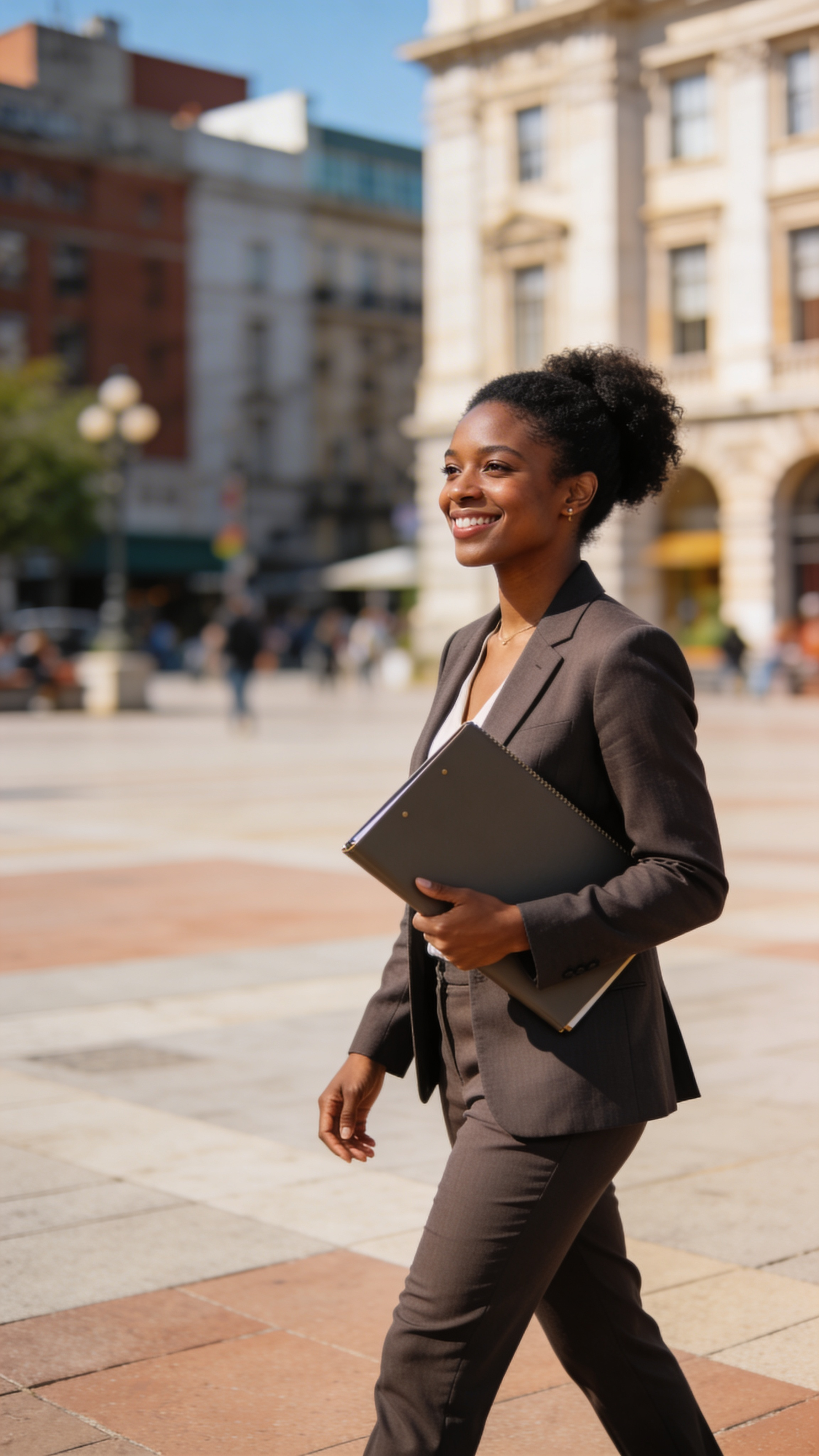 Three-quarter outdoor portrait of a Black/African American woman in her 30s in a city plaza, walking slowly while holding a portfolio folder, confident smile. She wears a tailored blazer and trousers, polished style. Background architecture is softly blurred, daylight with clean contrast. Great for branding photos for website and social. no captions, no writing, no text, no watermarks, no logos, no overlays