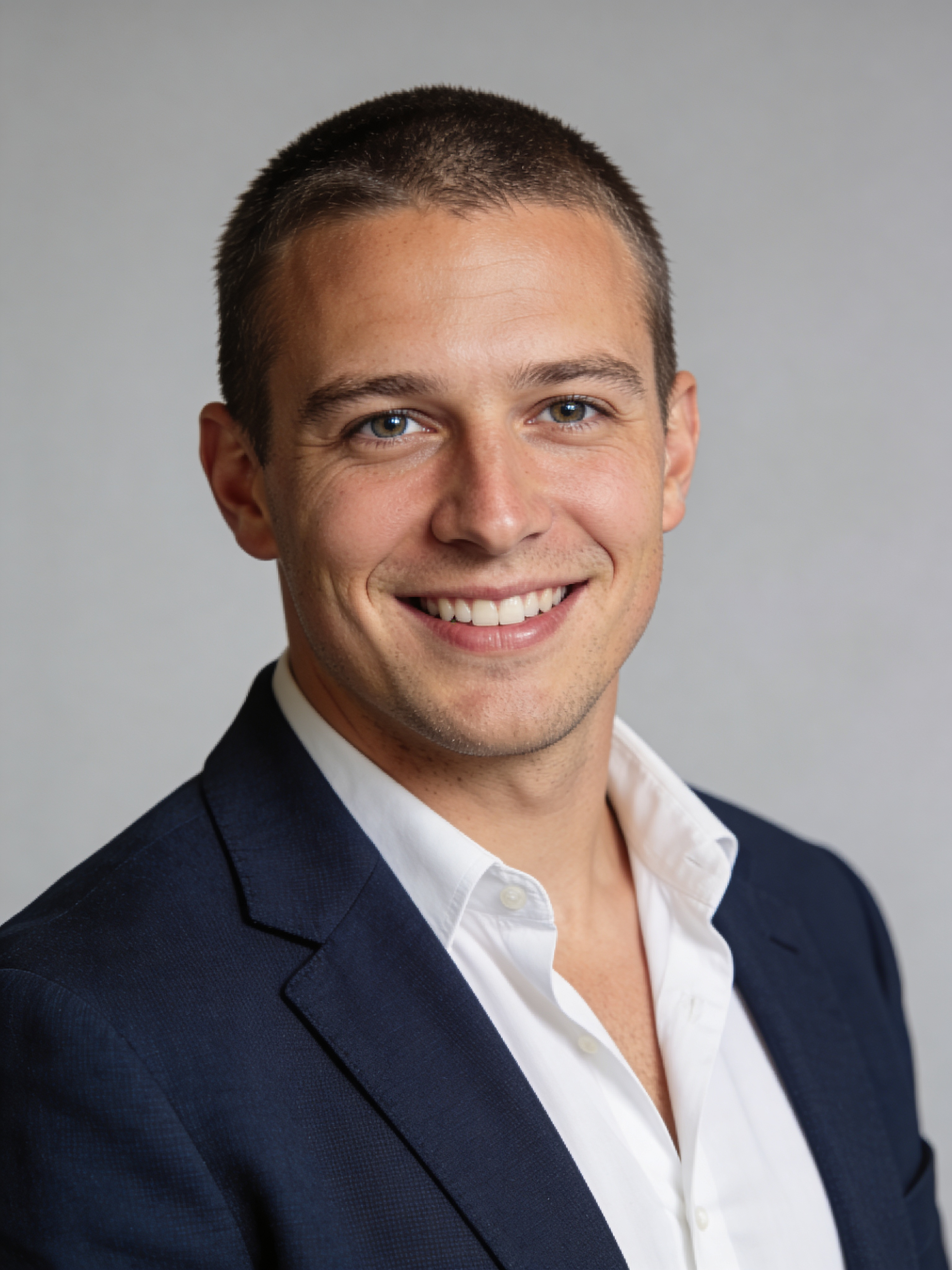 Professional headshot portrait of a Caucasian/White man in his early 30s, clean haircut, confident friendly smile, wearing a navy blazer and open-collar white shirt. Tight head-and-shoulders framing with a soft gray studio backdrop and shallow depth of field. He faces the camera with relaxed posture, slight shoulder angle, catchlights in eyes. Crisp studio lighting with gentle key and fill for a natural LinkedIn-ready look, no text, no watermarks, no logos, no overlays, no captions, no writing