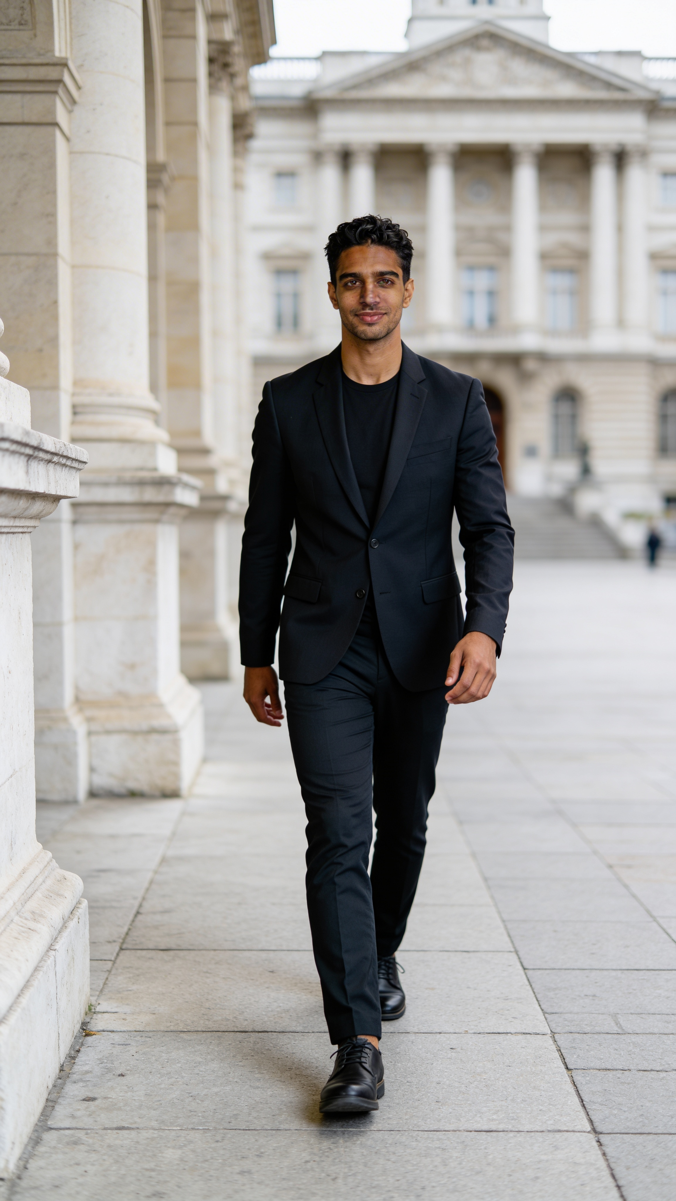 Single photograph of exactly the same person as the reference image(s), consistent identity realistic photograph, male person, 32 years old, dark-brown eyes, black hair color, textured hair style, caramel skin Hair color must stay black. Keep hairstyle consistent (textured). Do not change defining physical features. No wigs. No hats. Face unobscured. Full-body shot. Outdoor stone-architecture scene near a civic building, overcast light for soft shadows. Subject walking slowly toward camera, full-body portrait, confident posture, relaxed professional smile. Outfit: tailored black or navy suit, comfortable professional shoes. Background blurred, no signage. Lifestyle lawyer headshots photoshoot alternative that still looks premium. no captions, no writing, no text, no watermarks, no logos, no overlays