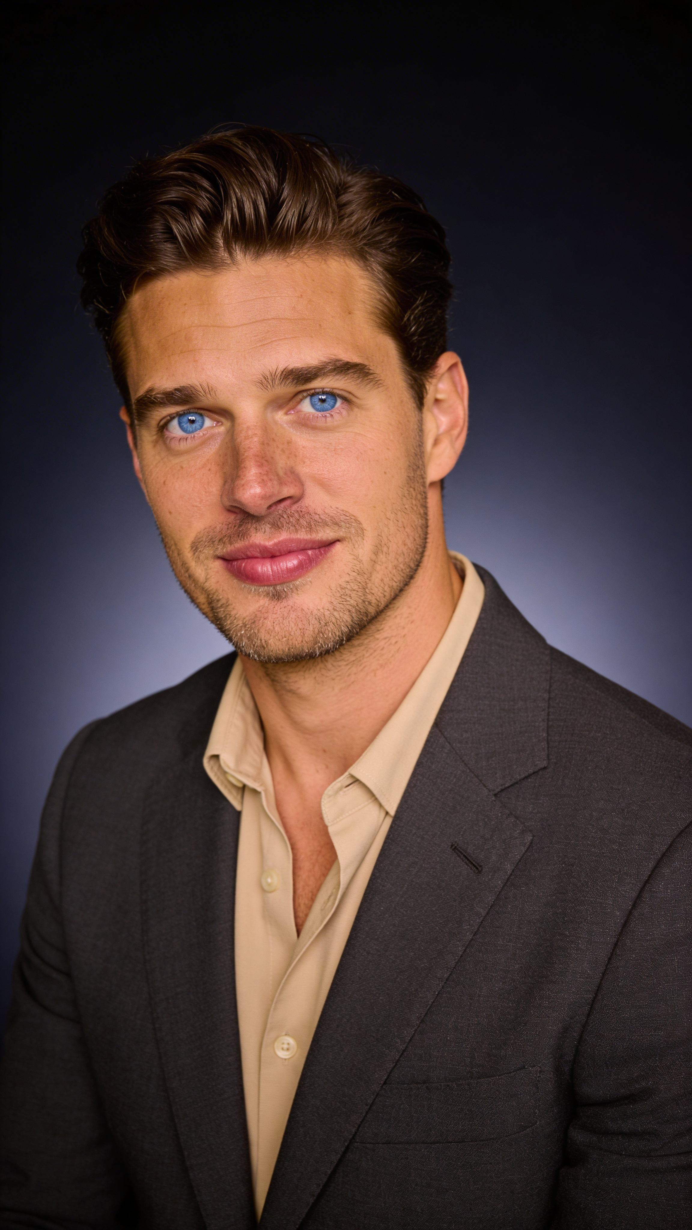 Single photograph of exactly the same person as the reference image(s), consistent identity realistic photograph, male person, 34 years old, blue eyes, dark-brown hair color, side-part hair style, beige skin Hair color must stay dark-brown. Keep hairstyle consistent (side-part). Do not change defining physical features. No wigs. No hats. Face unobscured. Headshot shot. Classic dark studio scene with subtle rim light and a deep navy background gradient. Subject wearing a charcoal suit with open-collar shirt (no tie), modern attorney look. Head-and-shoulders framing, calm expression, slight smile. Crisp focus on eyes, natural skin texture, editorial polish suitable for law firm bios and speaking profiles. no captions, no writing, no text, no watermarks, no logos, no overlays
