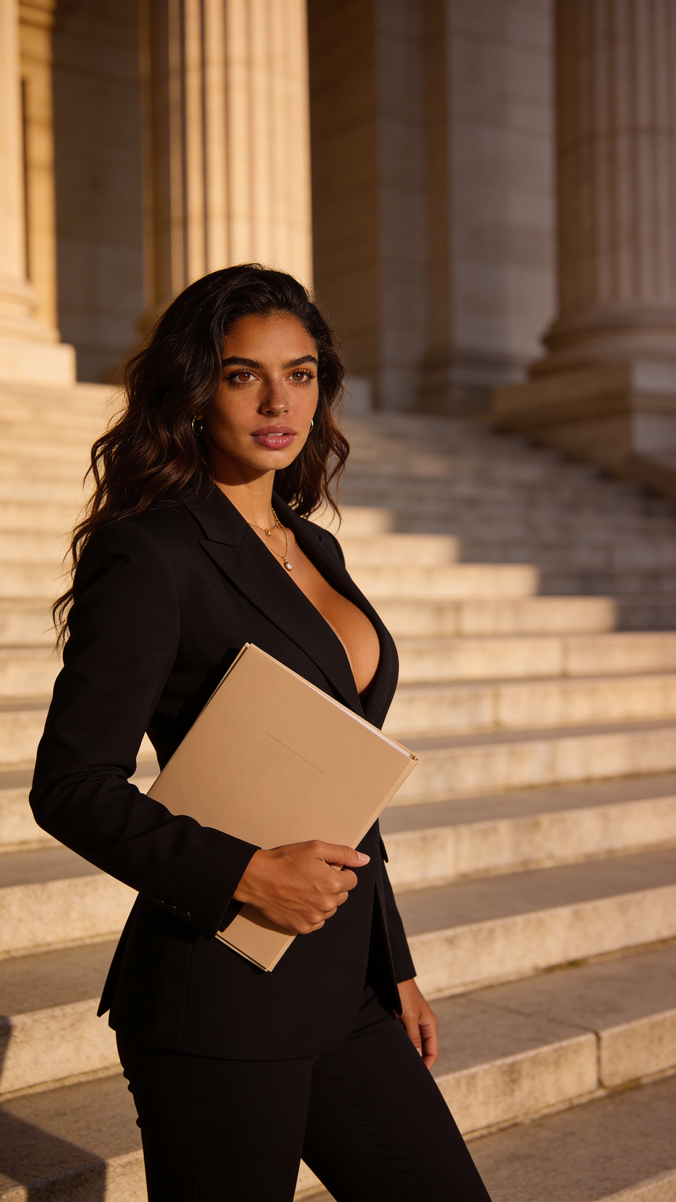 Single photograph of exactly the same person as the reference image(s), consistent identity realistic photograph, female person, 27 years old, brown eyes, dark-brown hair color, wavy hair style, olive skin Hair color must stay dark-brown. Keep hairstyle consistent (wavy). Do not change defining physical features. No wigs. No hats. Face unobscured. Environmental shot. Courthouse steps scene at early morning with soft directional natural light. Subject standing in a three-quarter pose, holding a plain folder with no markings, calm confident expression. Outfit: dark suit with conservative styling, minimal accessories. Background: stone columns softly blurred, no signage. Clean, authoritative attorney profile photo vibe. no captions, no writing, no text, no watermarks, no logos, no overlays
