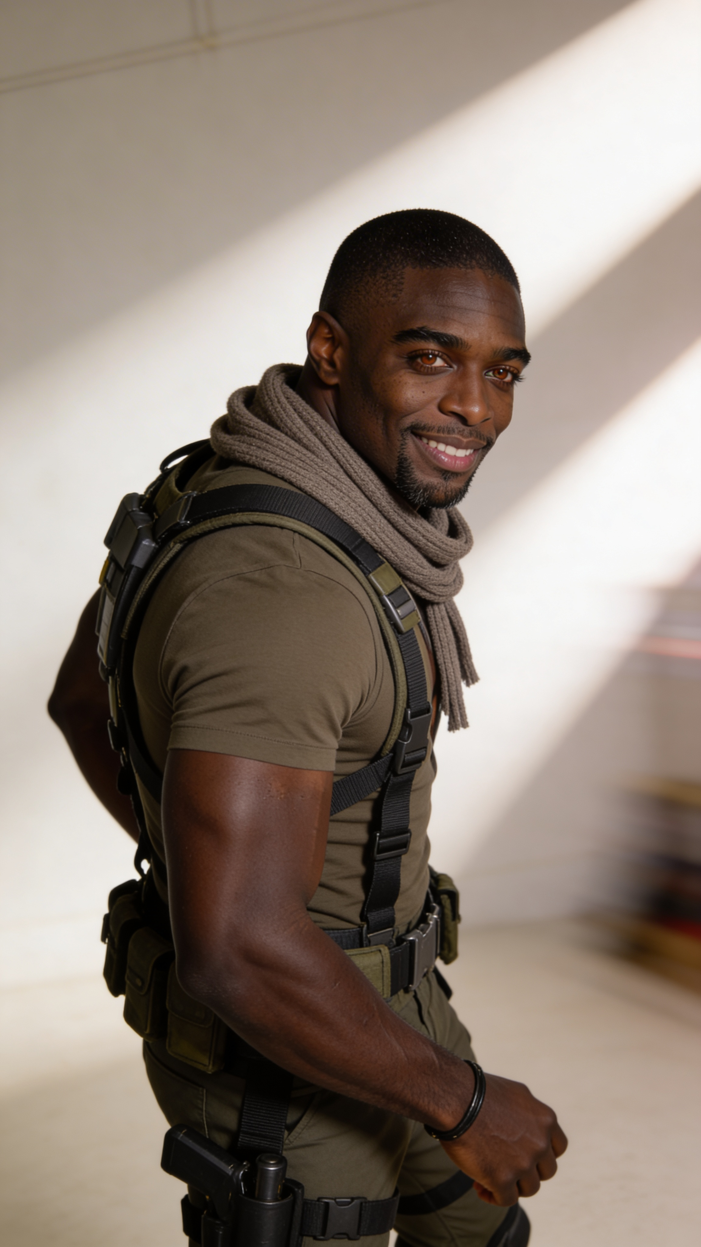 Single photograph of exactly the same person as the reference image(s), consistent identity realistic photograph, male person, 39 years old, dark-brown eyes, black hair color, classic hair style, ebony skin Hair color must stay black. Keep hairstyle consistent (classic). Do not change defining physical features. No wigs. No hats. Face unobscured. Full-body shot. Action-style full-body shot for a Fortnite cosplay photoshoot of yourself: indoor set with directional light beams and slight motion blur background, sharp subject. The same character wears an adventurer cosplay with scarf and utility harness, captured mid-turn with a playful confident smile. Create multiple dynamic poses while keeping face and identity perfectly consistent. No captions, no writing, no text, no watermarks, no logos, no overlays
