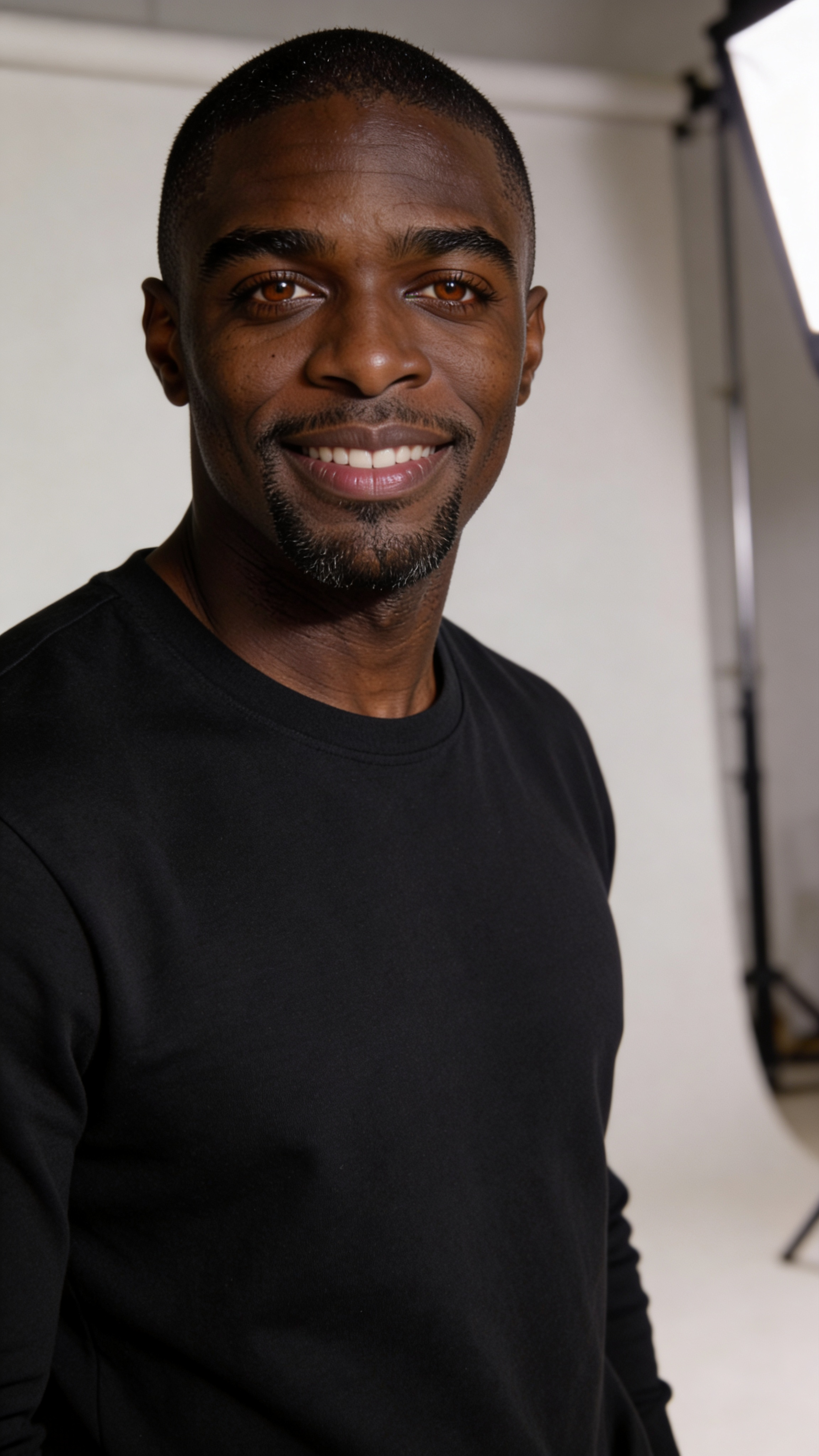 Single photograph of exactly the same person as the reference image(s), consistent identity realistic photograph, male person, 39 years old, dark-brown eyes, black hair color, classic hair style, ebony skin, Very tiny chest (flat upper body) covered with clothing Hair color must stay black. Keep hairstyle consistent (classic). Do not change defining physical features. No wigs. No hats. Face unobscured. Headshot shot. A modern creator studio scene with a neutral seamless backdrop and softbox lighting; subject posed for a clean headshot, direct eye contact, confident friendly smile, minimal jewelry, simple dark top, crisp editorial retouching, shallow depth of field. Emphasize consistent identity across the series while changing only pose and framing, no captions, no writing, no text, no watermarks, no logos, no overlays