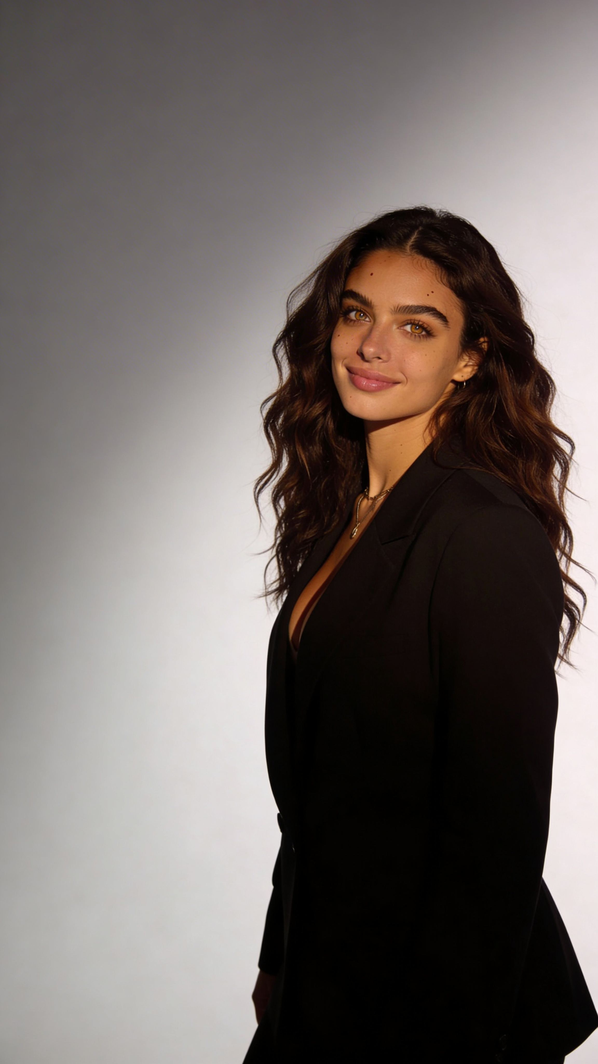 Single photograph of exactly the same person as the reference image(s), consistent identity realistic photograph, female person, 24 years old, hazel eyes, dark-brown hair color, wavy hair style, olive skin Hair color must stay dark-brown. Keep hairstyle consistent (wavy). Do not change defining physical features. No wigs. No hats. Face unobscured. Headshot shot. High-fashion editorial studio shoot scene with a clean gray seamless background and dramatic side lighting. Wardrobe is a structured black blazer with minimalist jewelry, styled hair, and polished makeup. Pose is a confident head-and-shoulders angle with direct eye contact and a subtle smile. Add a soft rim light for separation and crisp catchlights, premium editorial retouching while keeping natural skin texture. no text, no watermarks, no logos, no overlays, no captions, no writing