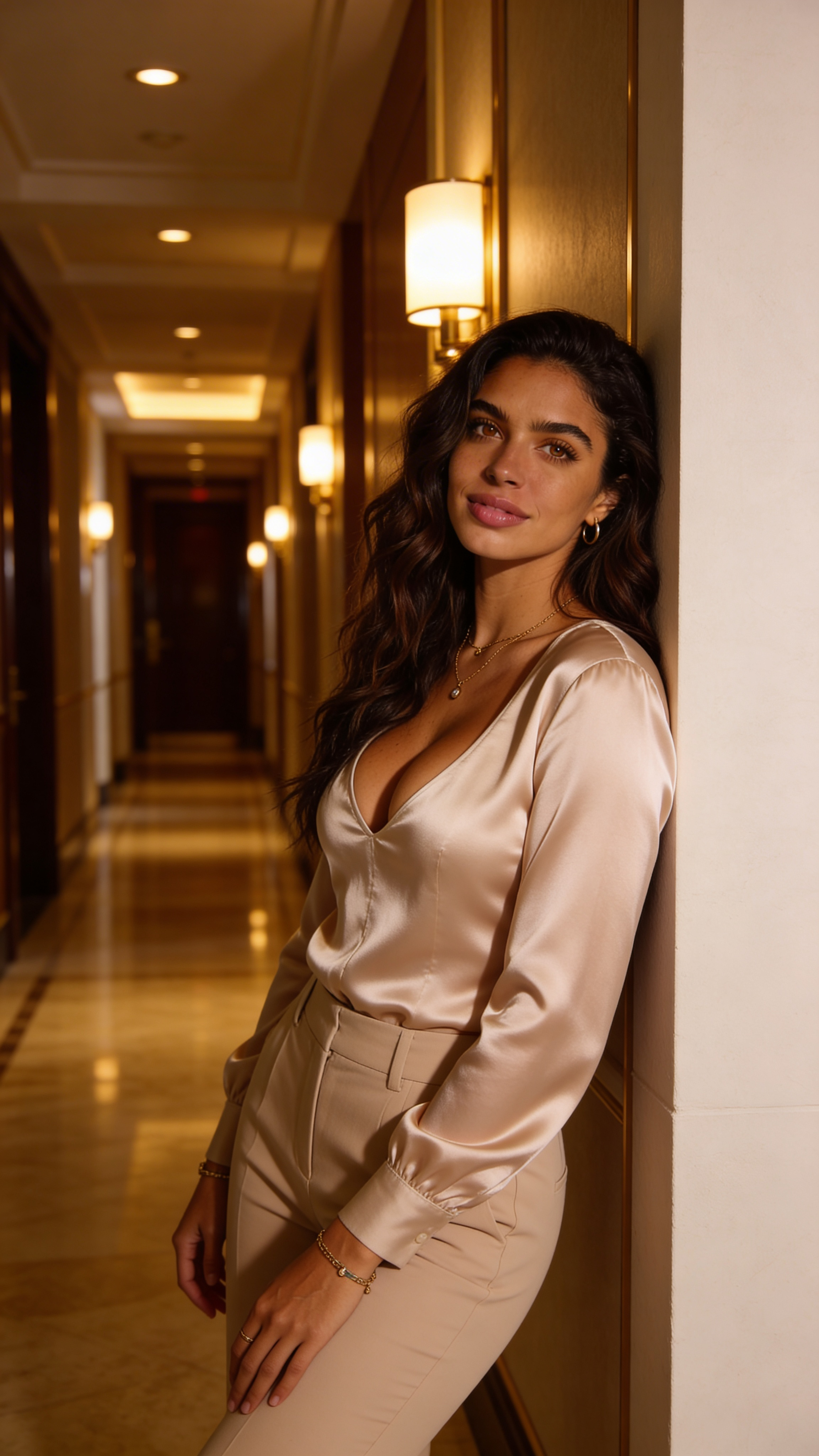 Single photograph of exactly the same person as the reference image(s), consistent identity realistic photograph, female person, 27 years old, brown eyes, dark-brown hair color, wavy hair style, olive skin Hair color must stay dark-brown. Keep hairstyle consistent (wavy). Do not change defining physical features. No wigs. No hats. Face unobscured. Half-body shot. Luxury hotel corridor editorial scene with warm practical lights and rich textures. Wardrobe is satin top with tailored trousers, elegant accessories. Pose is half-body leaning against wall, shoulders angled, calm confident smile. Lighting is warm practicals balanced with soft key, glossy magazine look, shallow depth of field. no text, no watermarks, no logos, no overlays, no captions, no writing