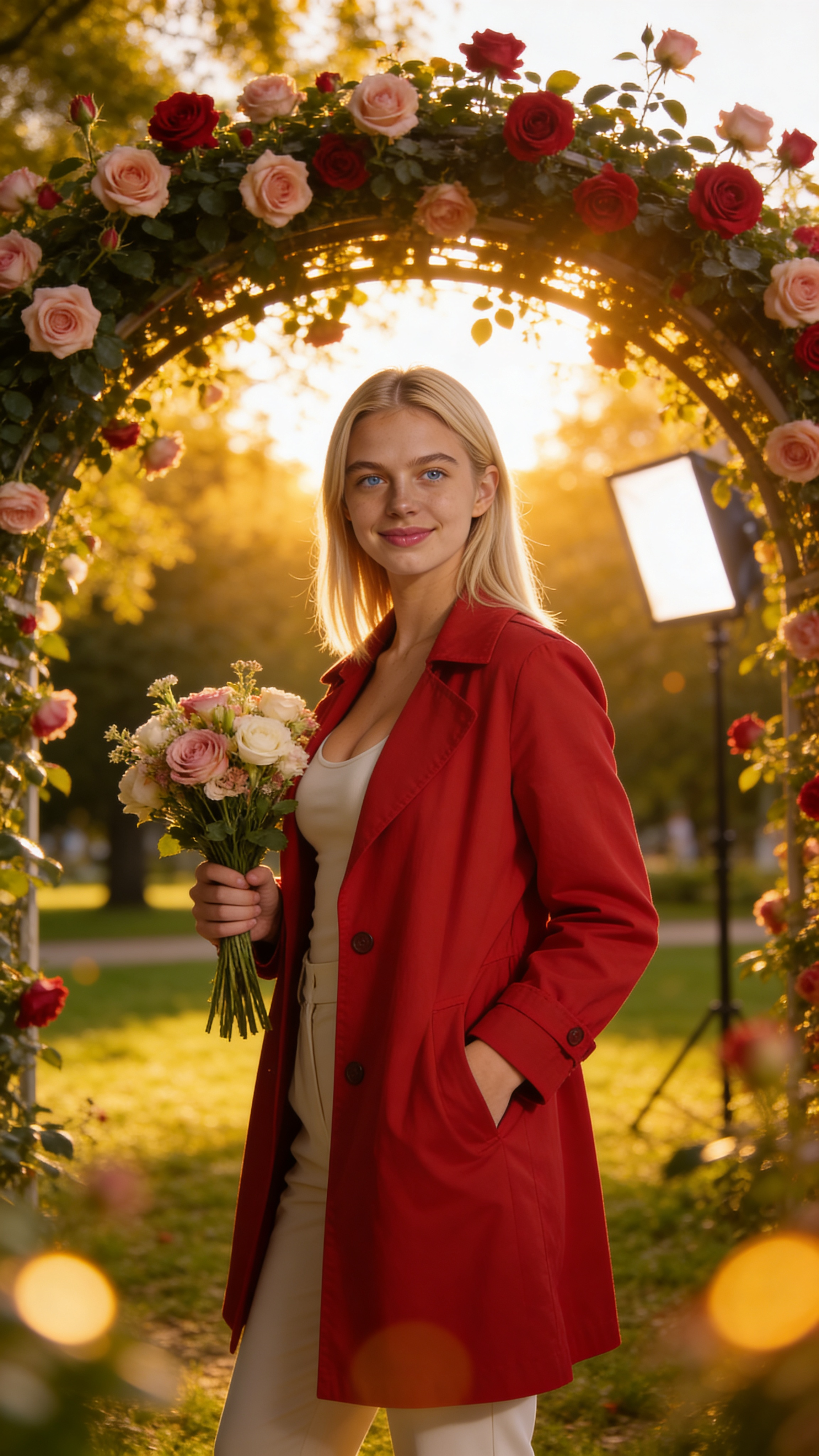 A woman/female person. Environmental shot. Outdoor golden-hour park scene with a rose archway behind the same AI character, 3/4 body portrait. Pose: standing relaxed, one hand holding a bouquet, the other in pocket, confident smile. Wardrobe: red coat over neutral outfit. Lighting: golden backlight with soft reflector, dreamy bokeh and natural realism, no captions, no writing, no text, no watermarks, no logos, no overlays