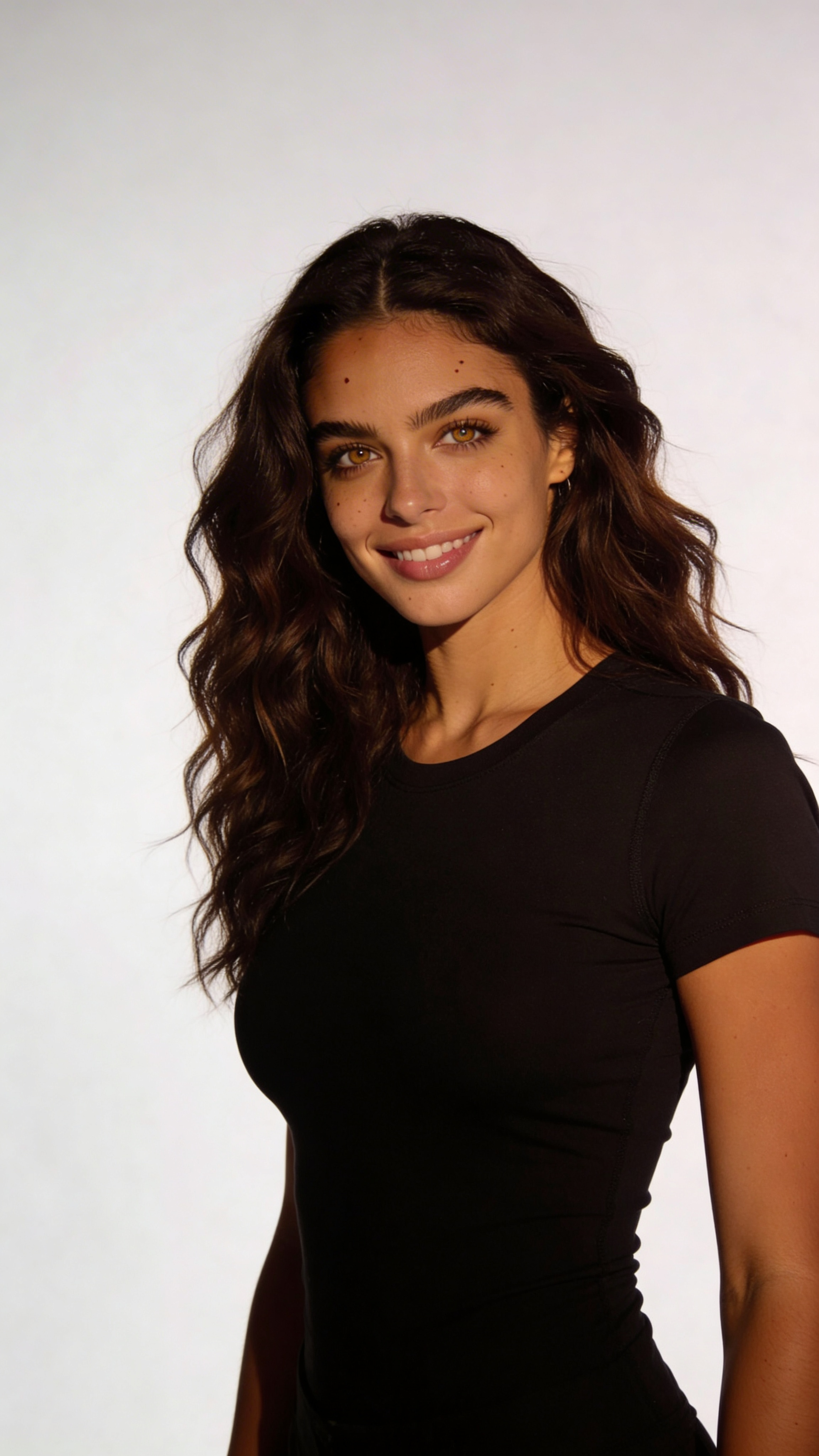 Single photograph of exactly the same person as the reference image(s), consistent identity realistic photograph, female person, 24 years old, hazel eyes, dark-brown hair color, wavy hair style, olive skin Hair color must stay dark-brown. Keep hairstyle consistent (wavy). Do not change defining physical features. No wigs. No hats. Face unobscured. Headshot shot. Commercial studio fitness headshot scene with a seamless light-gray backdrop, softbox key light and gentle rim light, clean editorial retouching. Outfit: fitted black performance top, minimal accessories. Pose: relaxed shoulders, direct eye contact, confident smile, hands loosely at sides. Crisp, professional fitness profile photo vibe; no captions, no writing anywhere; no text, no watermarks, no logos, no overlays