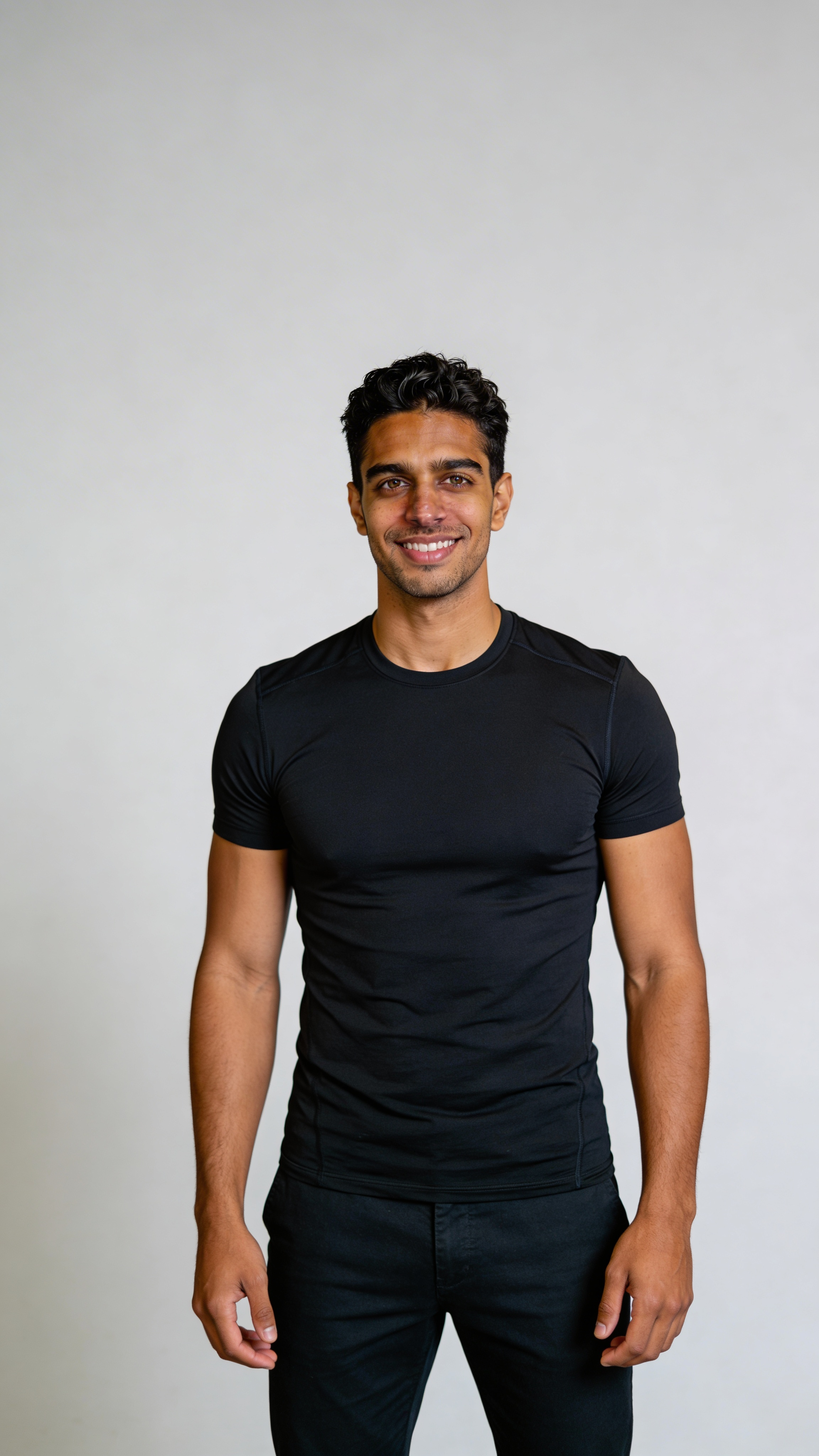 Single photograph of exactly the same person as the reference image(s), consistent identity realistic photograph, male person, 32 years old, dark-brown eyes, black hair color, textured hair style, caramel skin Hair color must stay black. Keep hairstyle consistent (textured). Do not change defining physical features. No wigs. No hats. Face unobscured. Headshot shot. Commercial studio fitness headshot scene with a seamless light-gray backdrop, softbox key light and gentle rim light, clean editorial retouching. Outfit: fitted black performance top, minimal accessories. Pose: relaxed shoulders, direct eye contact, confident smile, hands loosely at sides. Crisp, professional fitness profile photo vibe; no captions, no writing anywhere; no text, no watermarks, no logos, no overlays