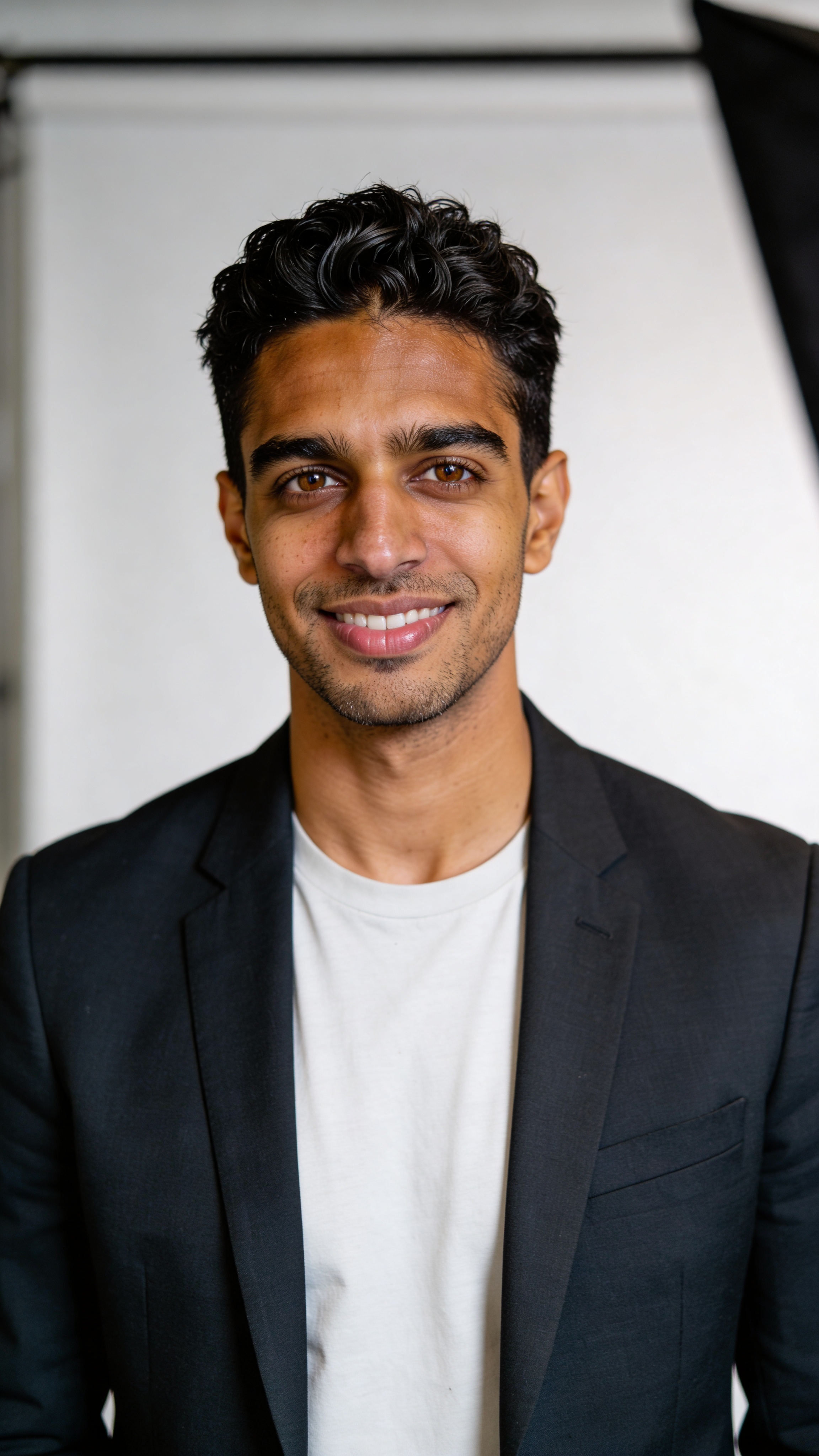 Single photograph of exactly the same person as the reference image(s), consistent identity realistic photograph, male person, 32 years old, dark-brown eyes, black hair color, textured hair style, caramel skin, Very tiny chest (flat upper body) covered with clothing Hair color must stay black. Keep hairstyle consistent (textured). Do not change defining physical features. No wigs. No hats. Face unobscured. Headshot shot. A clean, modern studio setup with a neutral light-gray backdrop and softbox lighting. The same character is framed as a crisp head-and-shoulders portrait with a confident, friendly smile, wearing a simple blazer over a solid top. Camera at eye level, shallow depth of field, natural skin texture, professional profile picture composition, no text, no watermarks, no logos, no overlays