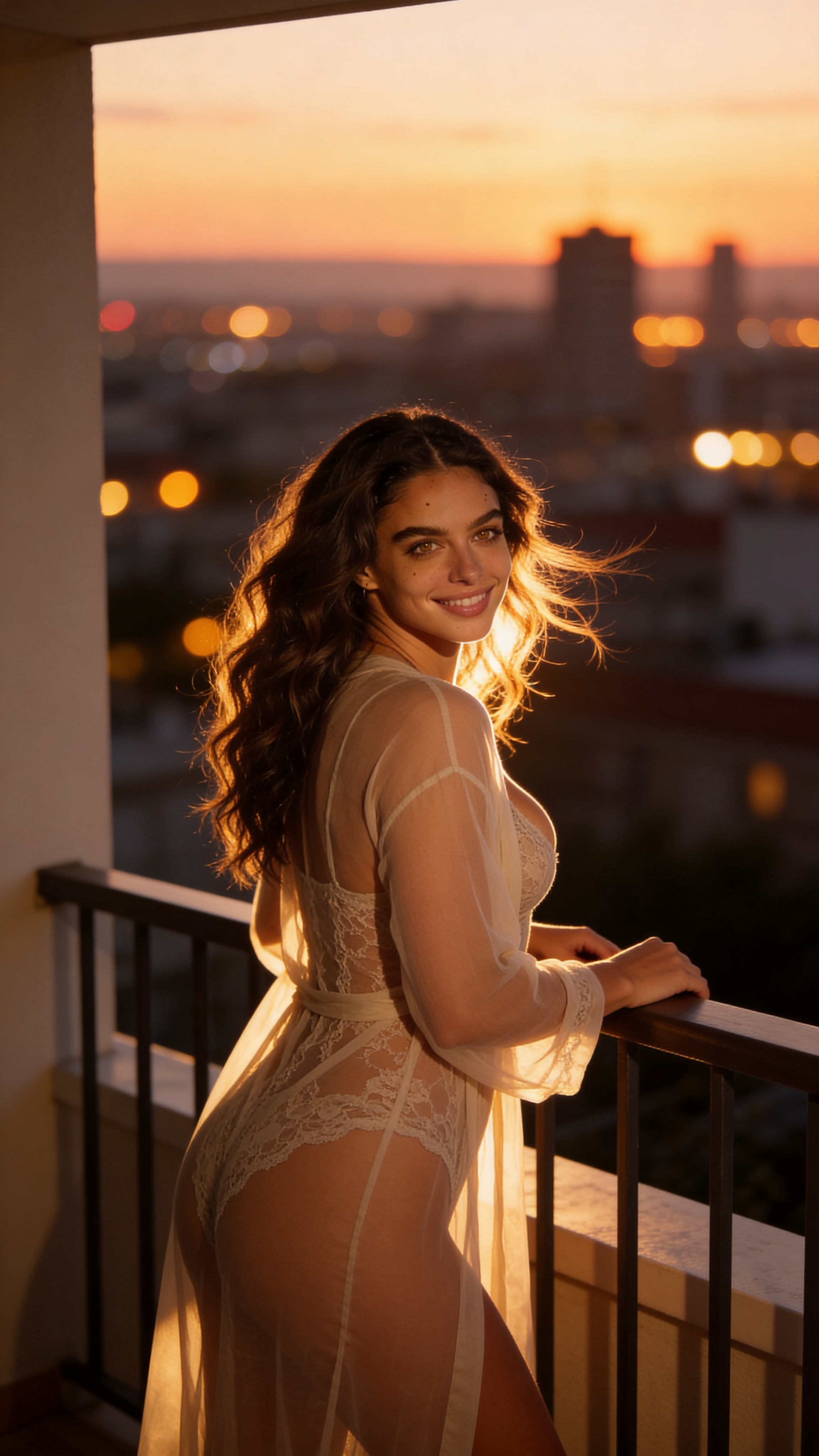 Single photograph of exactly the same person as the reference image(s), consistent identity realistic photograph, female person, 24 years old, hazel eyes, dark-brown hair color, wavy hair style, olive skin, medium natural breasts (Cup size D) covered with clothing Hair color must stay dark-brown. Keep hairstyle consistent (wavy). Do not change defining physical features. No wigs. No hats. Face unobscured. Full-body shot. Private balcony scene at sunset with soft bokeh city lights. The subject wears a lace bodysuit under a sheer robe, leaning on the railing, looking back at camera with a friendly smile. Warm rim light, gentle breeze in hair, cinematic mood, no captions, no writing, no text, no watermarks, no logos, no overlays