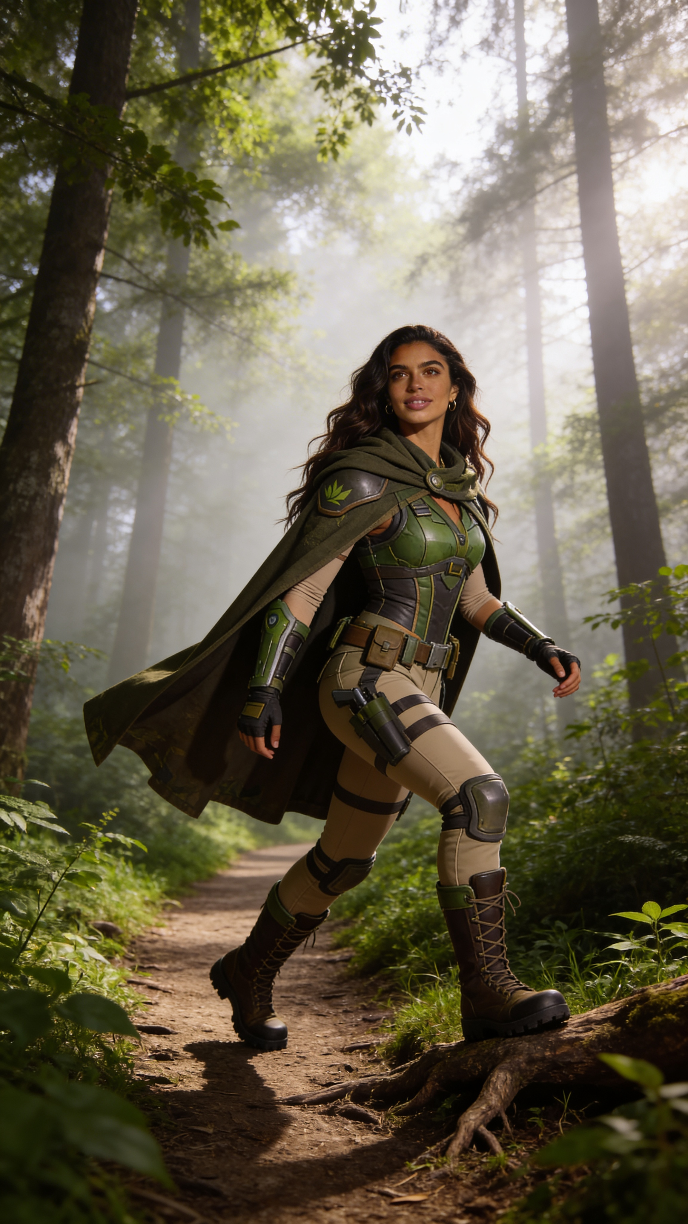 Single photograph of exactly the same person as the reference image(s), consistent identity realistic photograph, female person, 27 years old, brown eyes, dark-brown hair color, wavy hair style, olive skin Hair color must stay dark-brown. Keep hairstyle consistent (wavy). Do not change defining physical features. No wigs. No hats. Face unobscured. Environmental shot. Environmental portrait in a forest trail for a Fortnite skin cosplay portrait: diffused daylight through trees, soft haze, natural greens. The same character wears a Fortnite-inspired woodland scout cosplay with cape and boots, mid-step as if scouting, friendly determined expression. Create variations in walking pose and gaze direction while keeping the face identical. No captions, no writing, no text, no watermarks, no logos, no overlays
