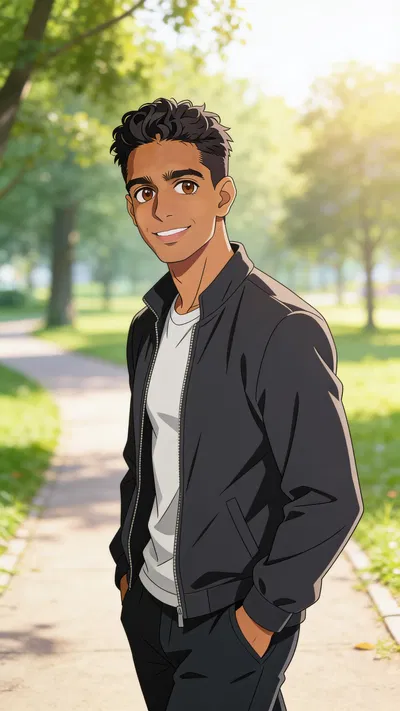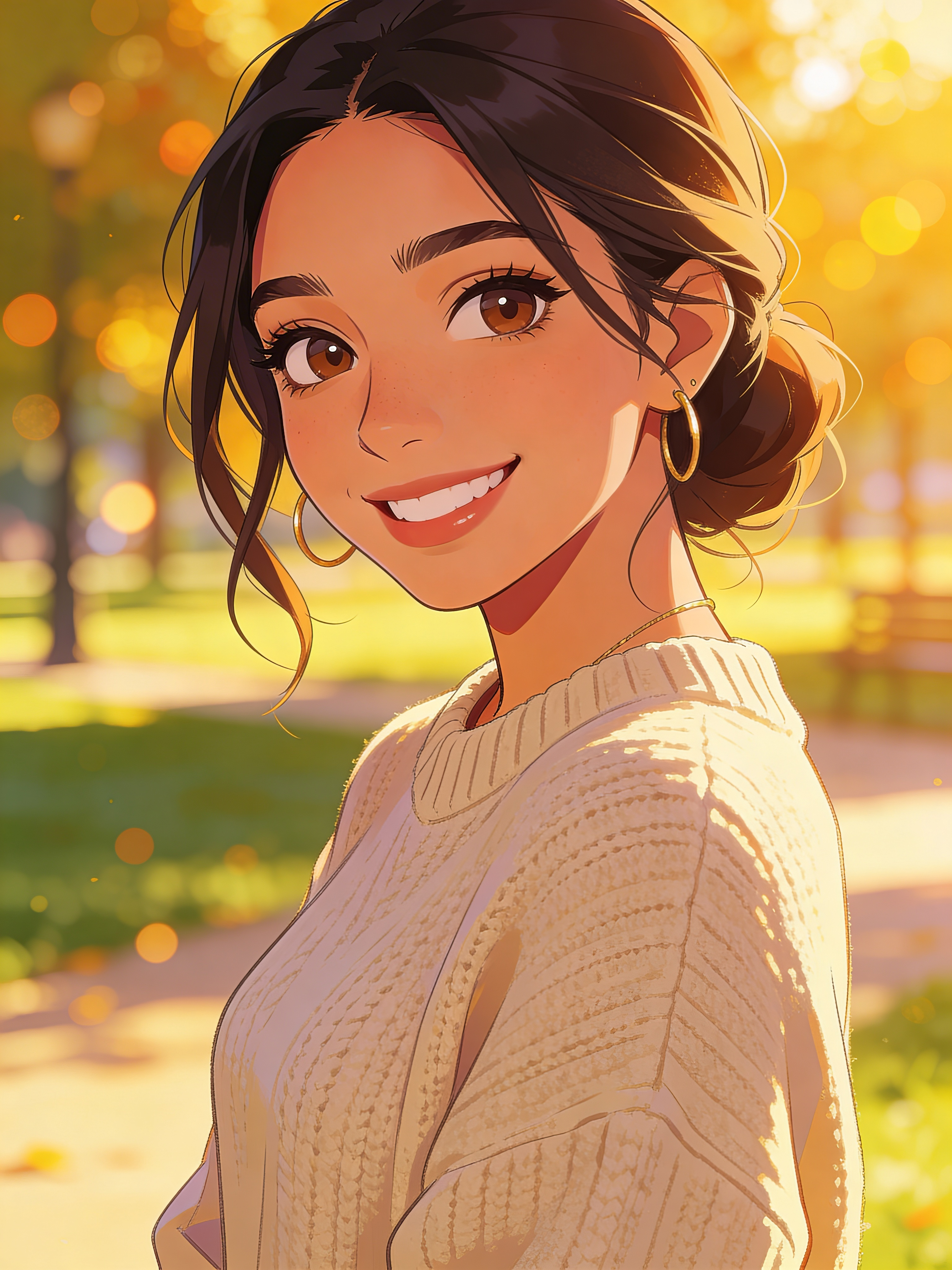 Anime-style profile picture illustration of a Hispanic/Latina woman in her late 20s, head-and-shoulders avatar framing, bright friendly smile. Cozy sweater, sunny park background with golden-hour bokeh, polished anime rendering with crisp eyes and smooth gradients. Designed for a cute anime pfp crop, no captions, no writing, no text, no watermarks, no logos, no overlays