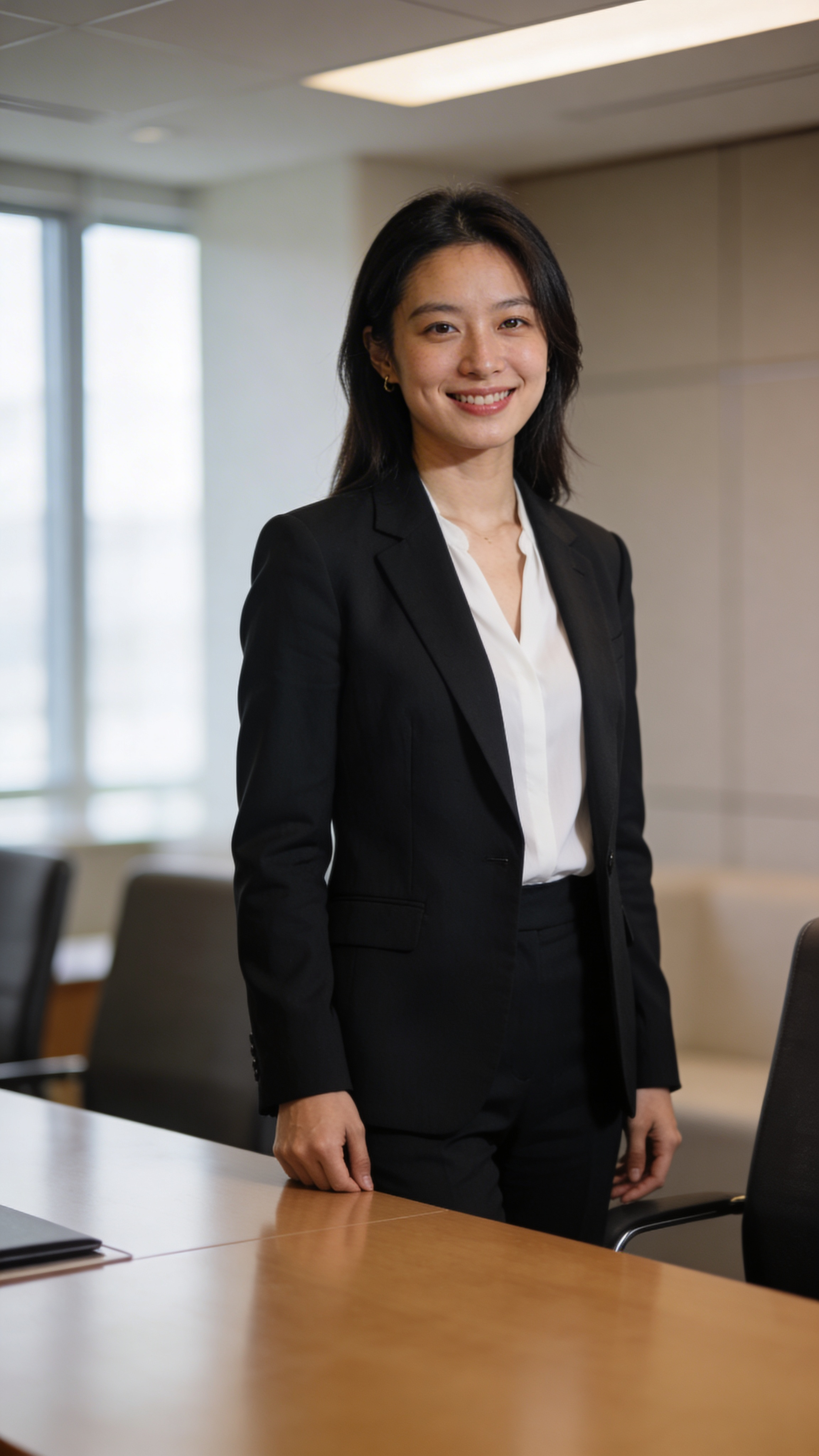 Three-quarter body portrait of an East Asian woman attorney in her late 20s, standing beside a conference table in a law firm meeting room. She wears a black blazer over a white blouse, arms relaxed at sides, confident friendly smile. Background: softly blurred modern office interior with neutral tones, no screens, no readable items. Lighting: soft overhead plus window fill for natural skin tone. No captions, no writing, no text, no watermarks, no logos, no overlays