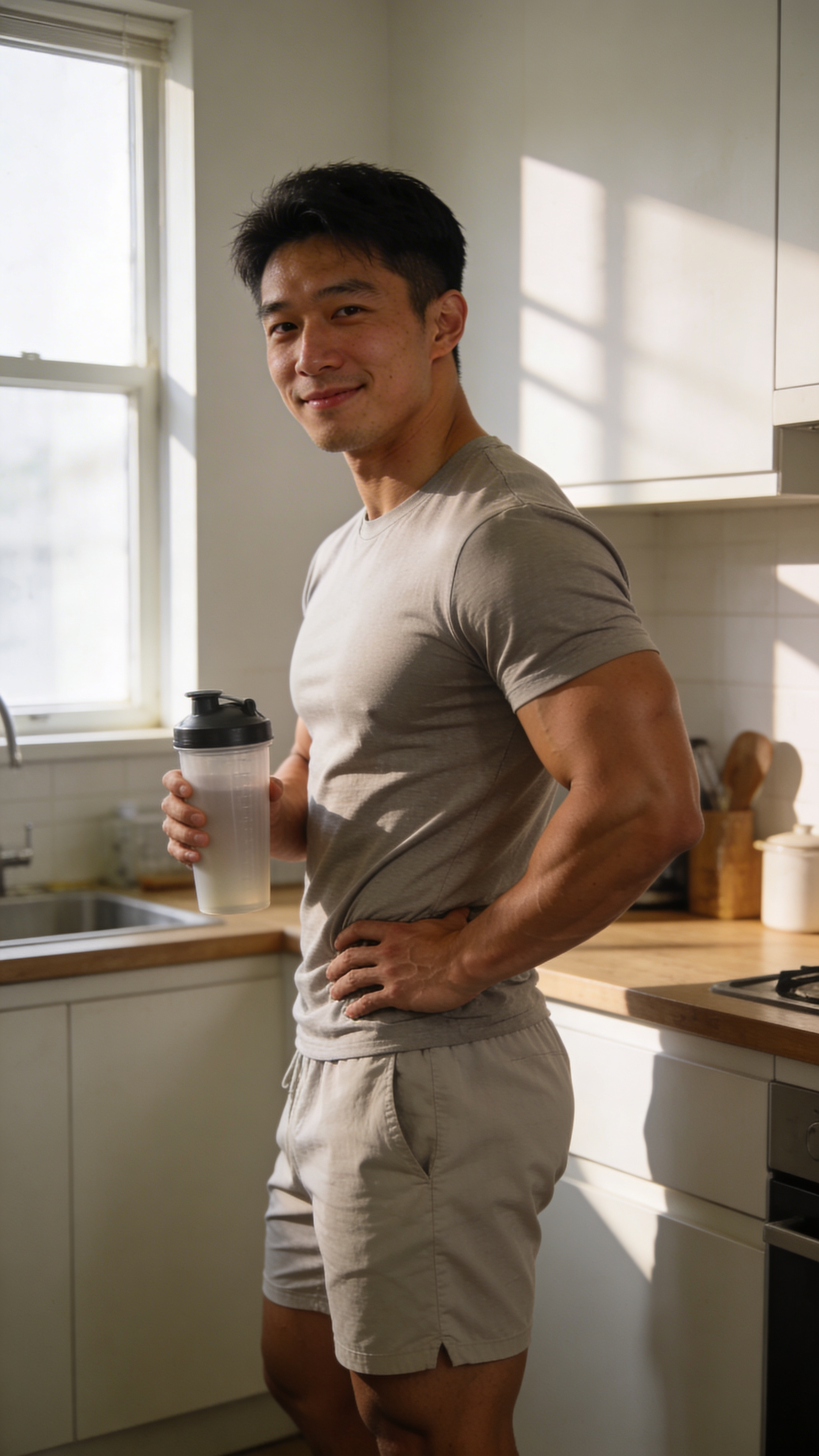 An East Asian male bodybuilder in a clean kitchen home setting (lifestyle progress vibe), 3/4 body shot holding a plain shaker bottle. Clothing: simple shorts and a plain fitted tee. Pose: relaxed quarter turn showing waist taper and arms, slight smile. Lighting: soft window light, natural shadows. Background: uncluttered countertops, no brands. No captions, no writing; no text, no watermarks, no logos, no overlays
