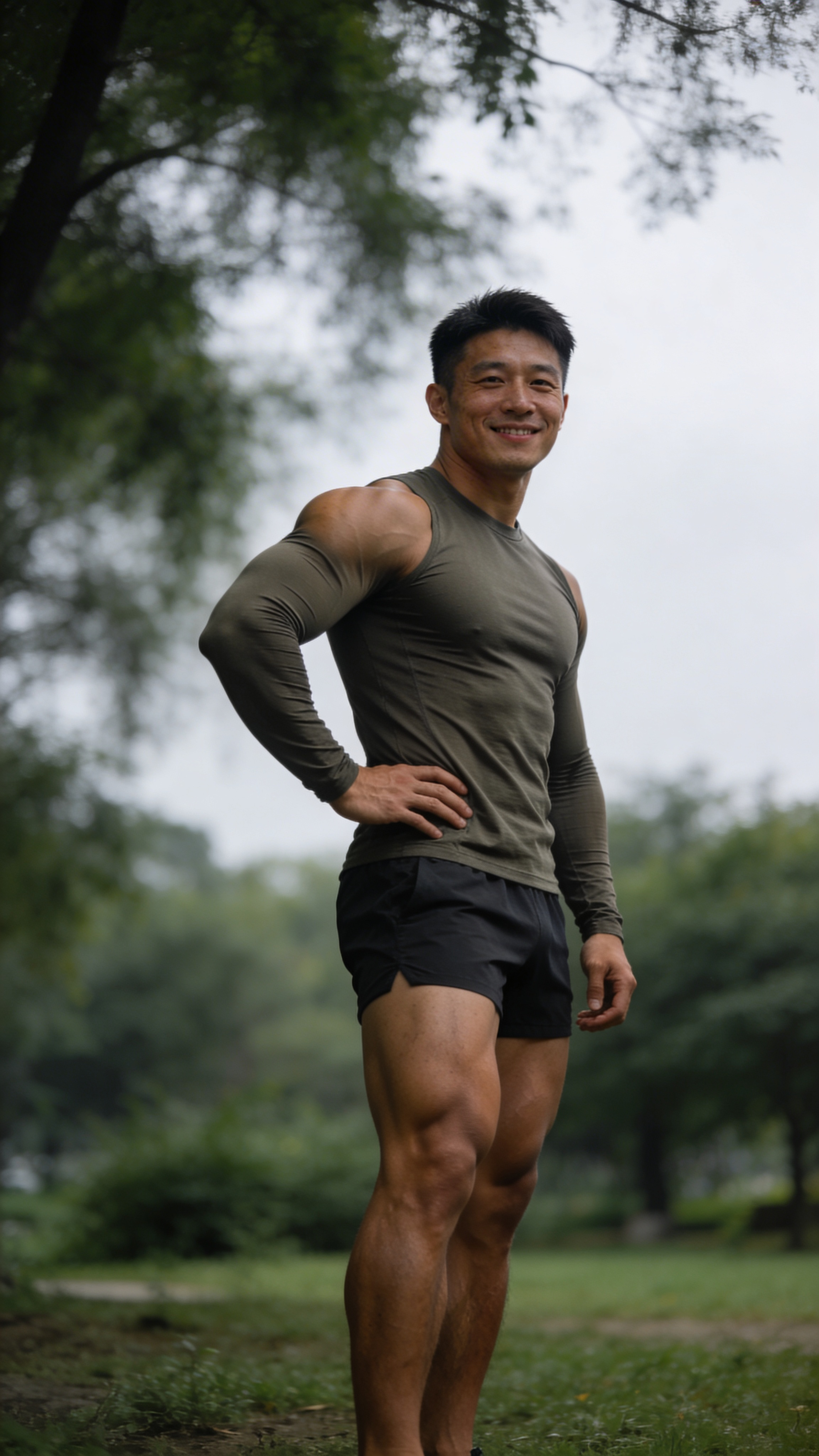 An East Asian male bodybuilder, full-body outdoor portrait in a quiet park. Pose: relaxed quarter turn, one hand on hip, friendly expression. Clothing: plain fitted long-sleeve athletic top and shorts, emphasizing shoulders and legs. Lighting: soft overcast daylight for even tone and realistic skin. Background: greenery blurred, no signage. No captions, no writing; no text, no watermarks, no logos, no overlays
