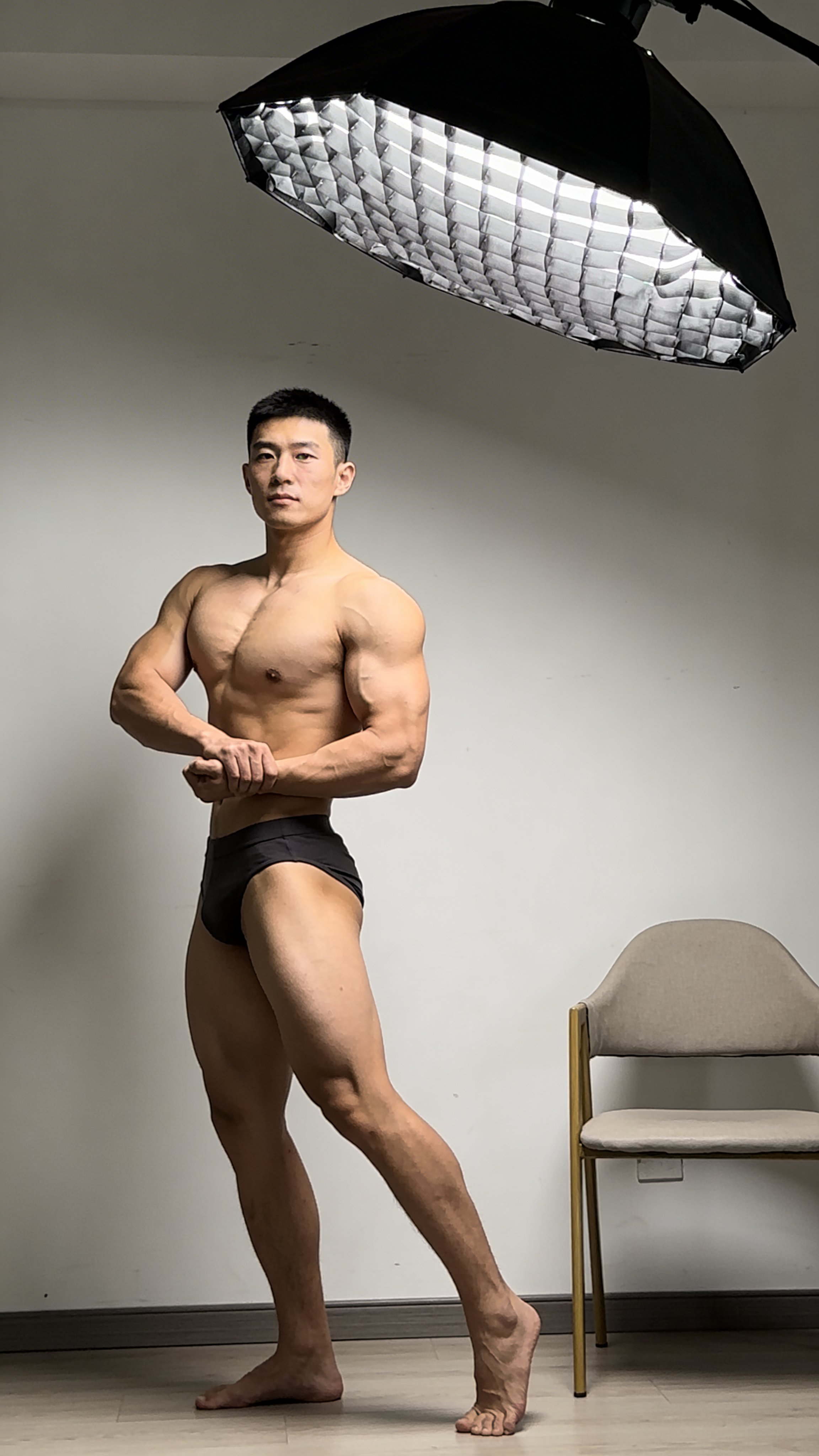 An East Asian male bodybuilder, full-body shot in a minimalist home setup. Pose: classic side chest pose with controlled posture, calm focused expression. Clothing: plain dark posing trunks, no accessories. Background: simple light wall and a single neutral chair, uncluttered. Lighting: one soft key light with reflector fill to highlight chest thickness and arm detail naturally. Clean composition, no captions, no writing; no text, no watermarks, no logos, no overlays