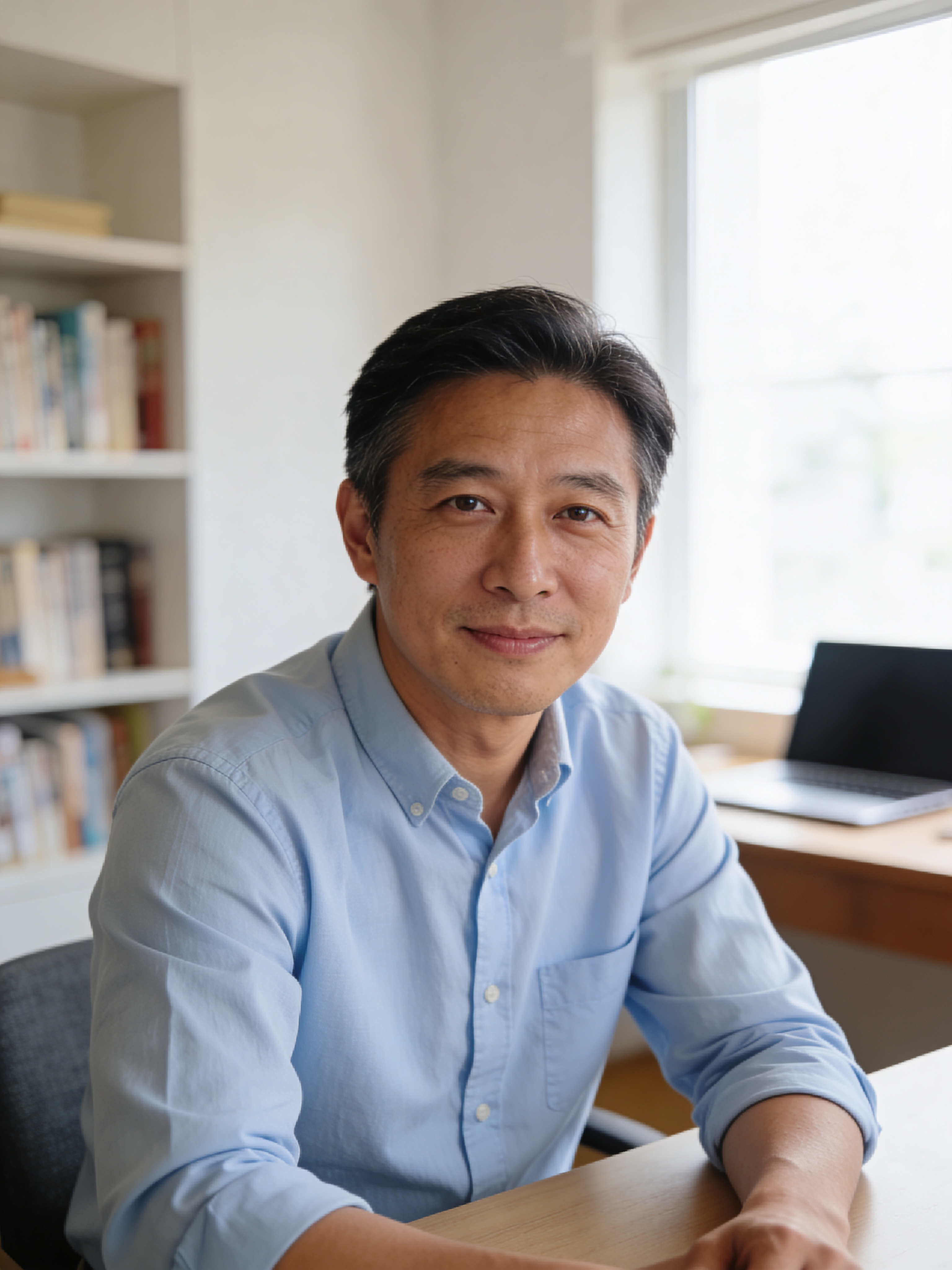 Environmental headshot of an East Asian man in his 40s seated at a desk in a bright home office, slight lean forward, calm confident expression, wearing a light-blue button-down. Background shows a tidy bookshelf and laptop softly blurred; natural daylight from side window, subtle catchlights. Crisp, authentic LinkedIn-ready look. Ensure there are no captions or writing anywhere in the image, no text, no watermarks, no logos, no overlays