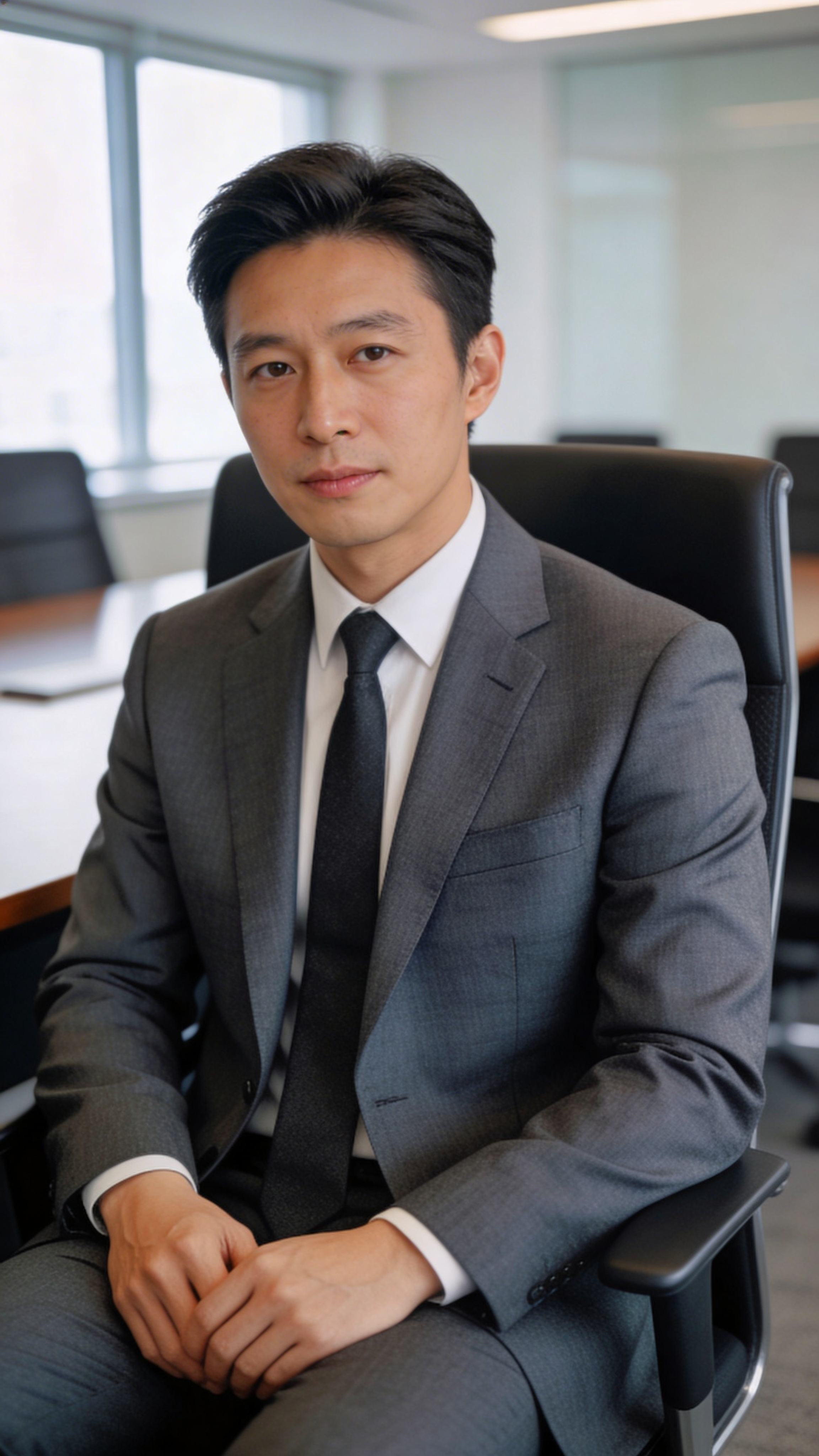 Half-body corporate portrait of an East Asian man in his 30s wearing a charcoal suit, seated in a conference room chair, hands resting on lap, calm confident expression. Background: clean meeting room with soft bokeh. Lighting: balanced window light and softbox fill; no captions or writing; no text, no watermarks, no logos, no overlays