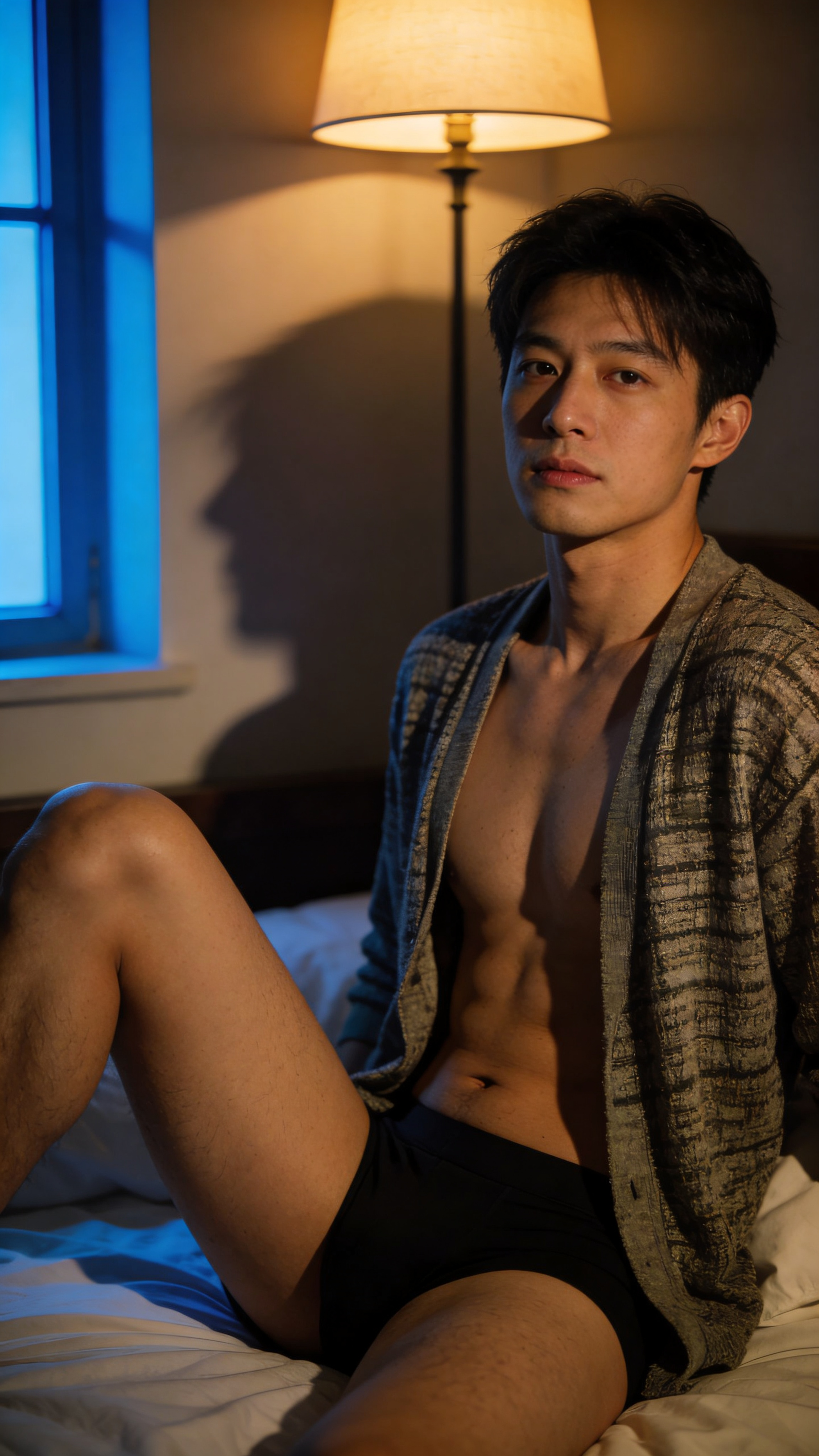 Moody bedroom portrait of an East Asian man, half-body shot sitting on the bed with one knee raised. Wearing black briefs and a partially open cardigan, confident calm expression. Soft lamp light with window rim light, cinematic shadows, tasteful male boudoir portraits feel, professional editorial styling. Clean image, no captions, no writing, no text, no watermarks, no logos, no overlays