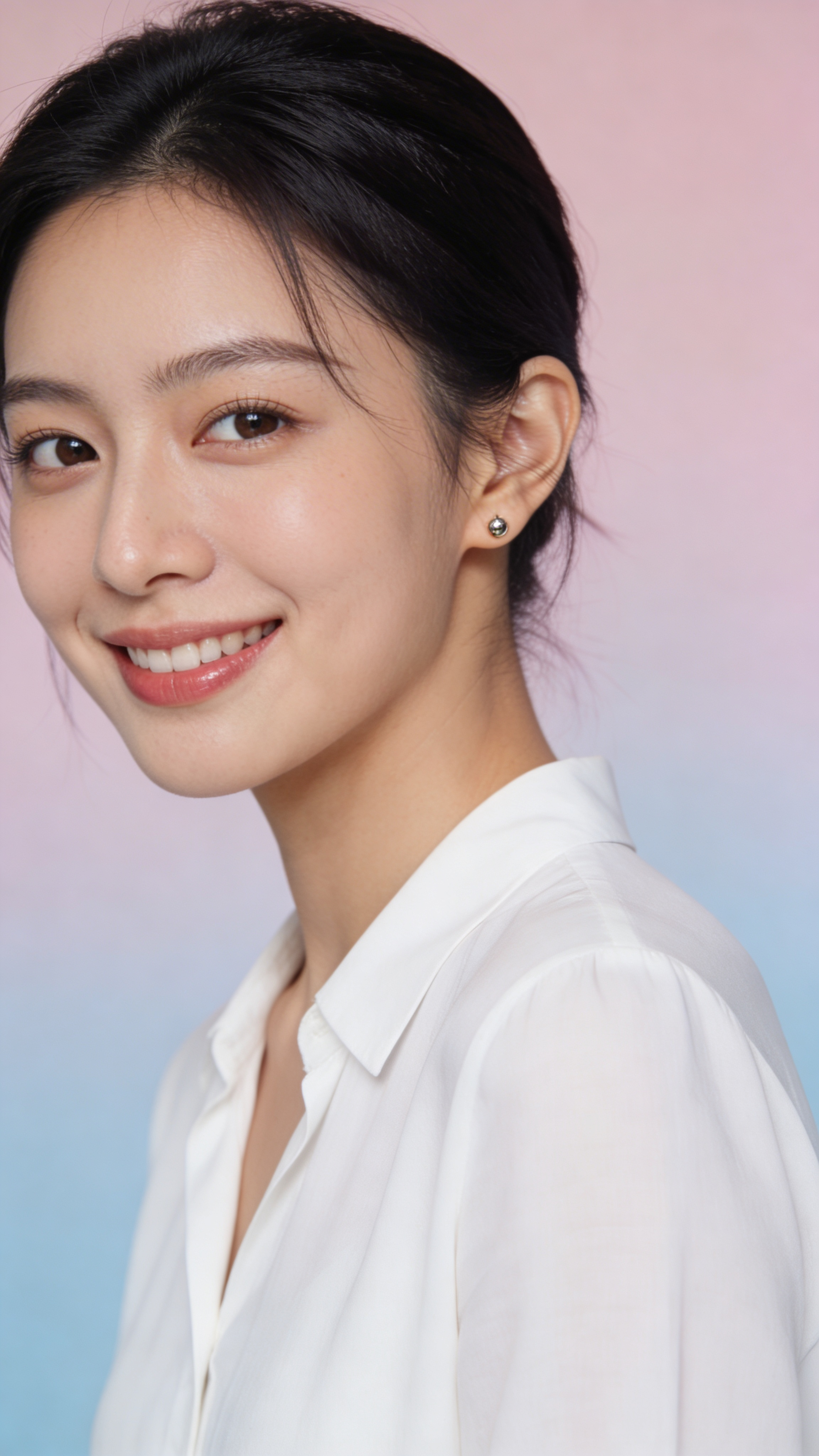 Close-up headshot of an East Asian woman in her mid-20s with clean beauty styling, slight side angle, confident smile. She wears a white blouse, simple stud earrings, natural makeup. Background: soft pastel studio backdrop. Even, diffused lighting for smooth skin and bright eyes, high-end portrait photography. Ensure no captions or writing; no text, no watermarks, no logos, no overlays