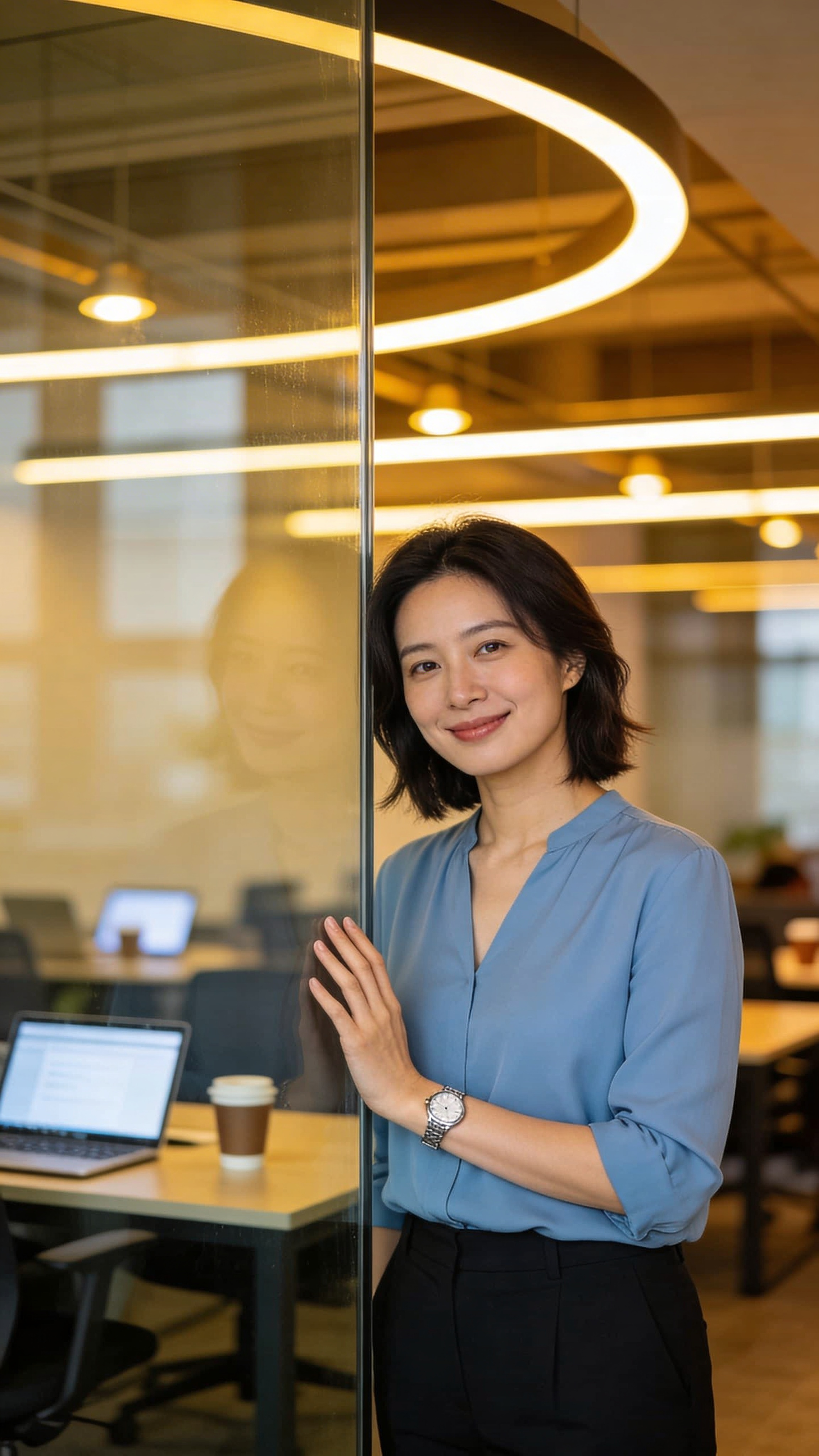 Environmental three-quarter portrait of an East Asian woman in her 30s in a modern coworking space, standing beside a glass wall, relaxed posture, professional smile. She wears a modest blouse and tailored pants, simple watch. Background: blurred desks and warm lights. Balanced indoor lighting for a premium, realistic portrait. No captions or writing; no text, no watermarks, no logos, no overlays