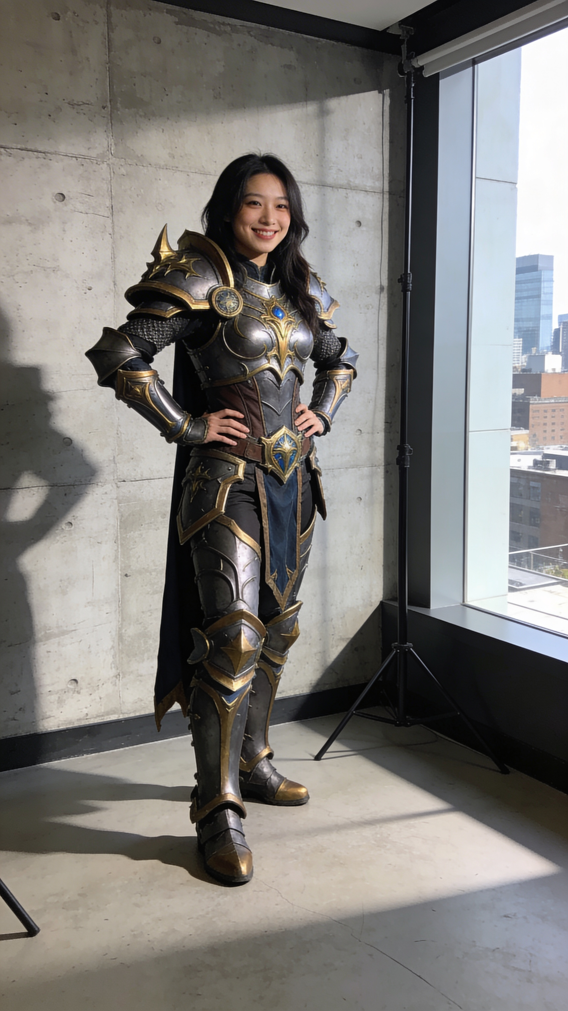 Full-body lifestyle portrait of an East Asian woman in World of Warcraft-inspired paladin armor cosplay in a modern studio corner with textured concrete wall. She stands powerfully, hands on hips, confident smile. Lighting: clean studio strobes with soft shadows. Crisp armor details, modern-meets-fantasy vibe, no captions, no writing, no text, no watermarks, no logos, no overlays