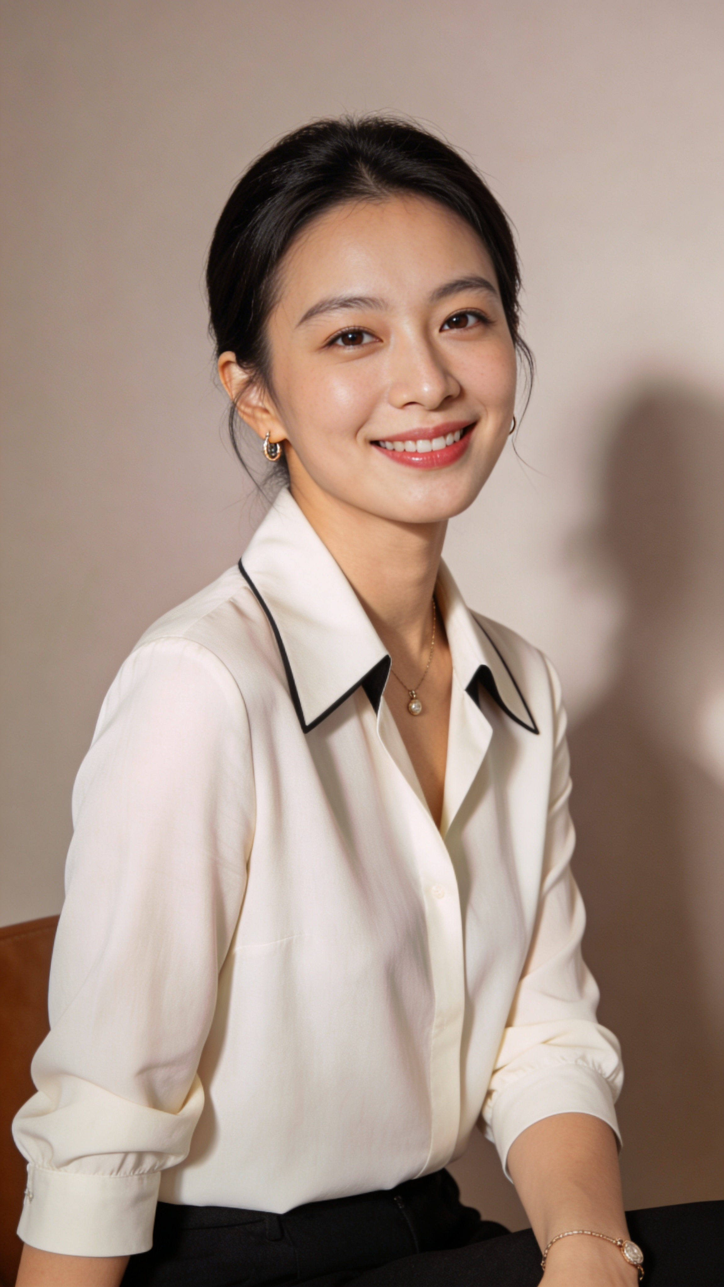 Studio half-body editorial portrait of an East Asian woman in her early 30s, seated with shoulders turned, approachable smile. She wears a crisp blouse with a fashion-forward collar and simple jewelry. Background is pale taupe seamless. Lighting is soft, even, and premium, with gentle shadow definition for a magazine portrait look. no text, no watermarks, no logos, no overlays, no captions, no writing