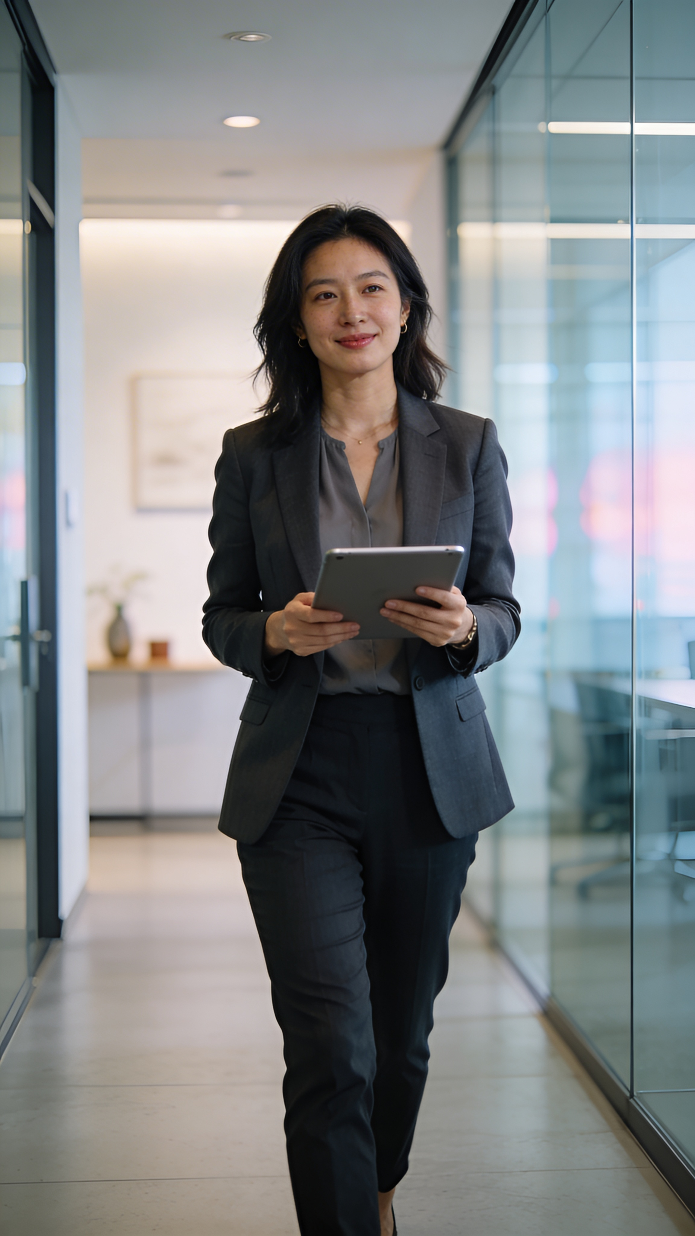 Environmental portrait of an East Asian woman in her 30s in a modern office hallway, walking slowly while holding a tablet, confident expression. She wears a blazer with a simple blouse, clean styling. Background shows glass walls with soft reflections, cool daylight balanced with indoor lighting. Looks like branding photos for website and social. no captions, no writing, no text, no watermarks, no logos, no overlays