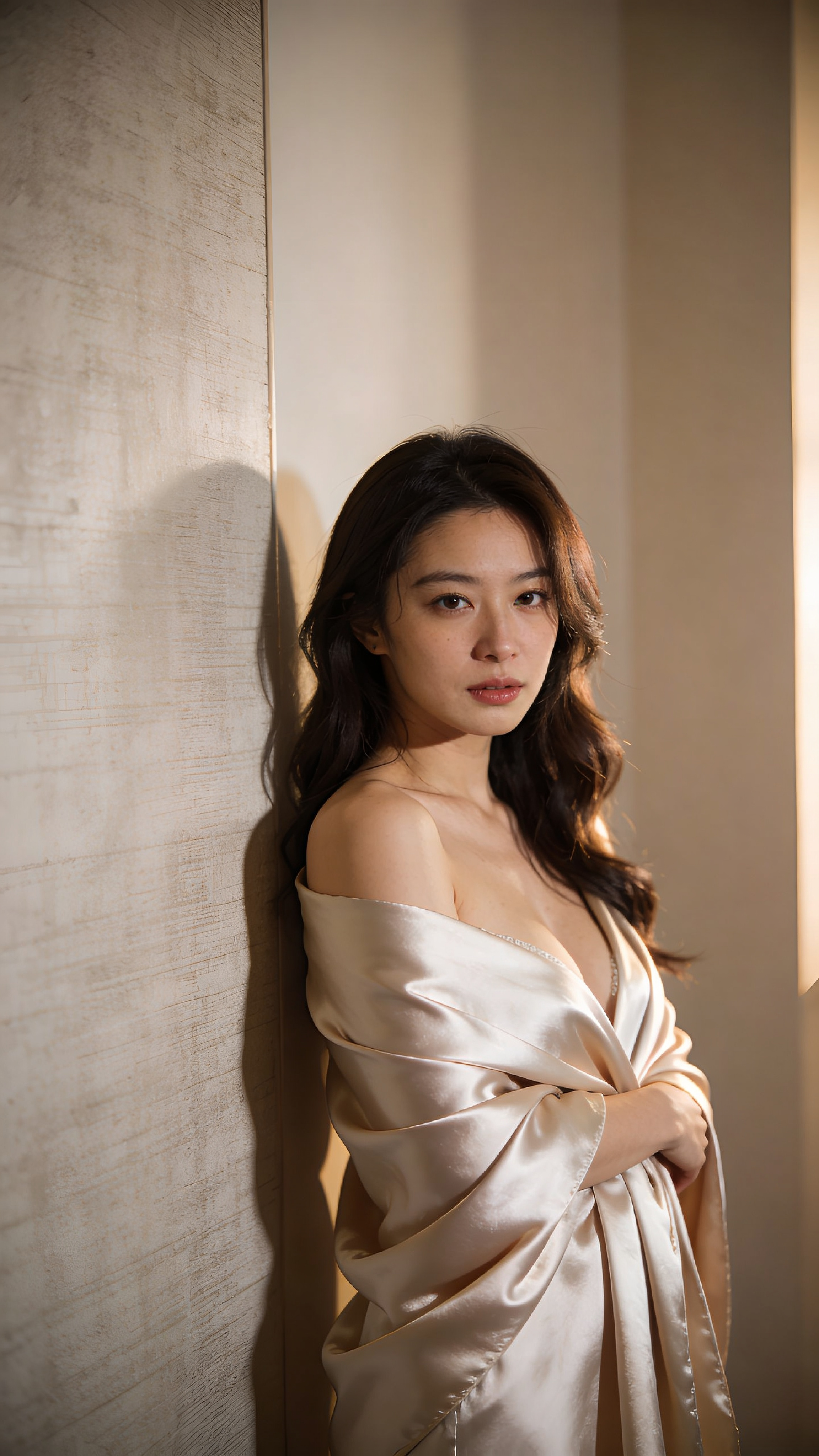 Professional boudoir portrait of an East Asian woman, 3/4 body shot, standing near a textured wall with a satin shawl wrapped around shoulders. Expression is composed and confident, eyes toward camera. Background is minimalist with warm neutral tones and shallow depth of field. Studio lighting with gentle rim light adds definition, tasteful boudoir feel. no captions, no writing, no text, no watermarks, no logos, no overlays