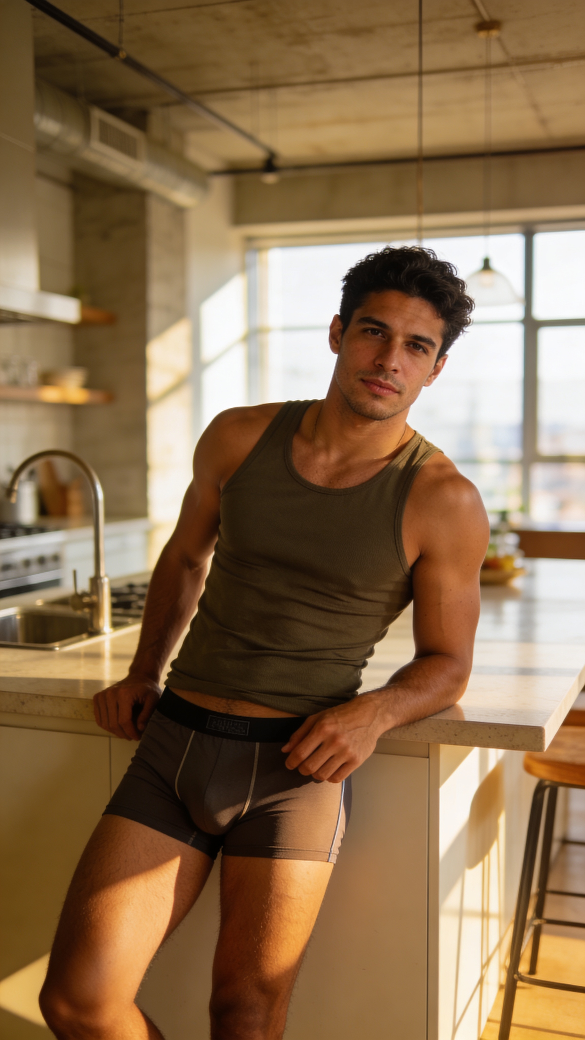 Environmental portrait of a Hispanic/Latino man in a stylish loft, 3/4 body shot leaning against a kitchen island. Wearing fitted boxer-briefs and a fitted tank top, relaxed confident look. Bright natural window light, clean modern background blur, tasteful boudoir photos for men vibe. Clean image, no captions, no writing, no text, no watermarks, no logos, no overlays