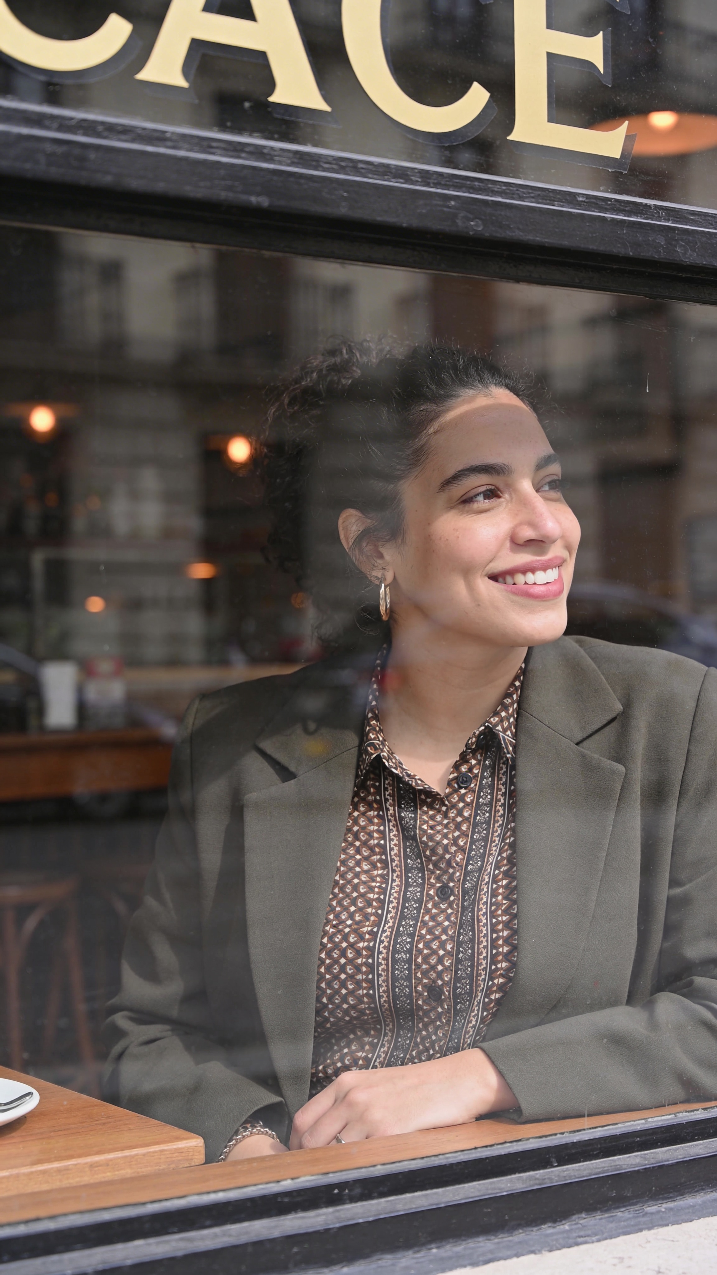 Editorial café window portrait of a Hispanic/Latina woman in her early 30s, half-body shot looking out window, relaxed smile. She wears a patterned blouse with blazer, chic editorial styling. Background is softly blurred street scene through glass. Lighting is natural window light with gentle shadow, warm editorial color. no text, no watermarks, no logos, no overlays, no captions, no writing