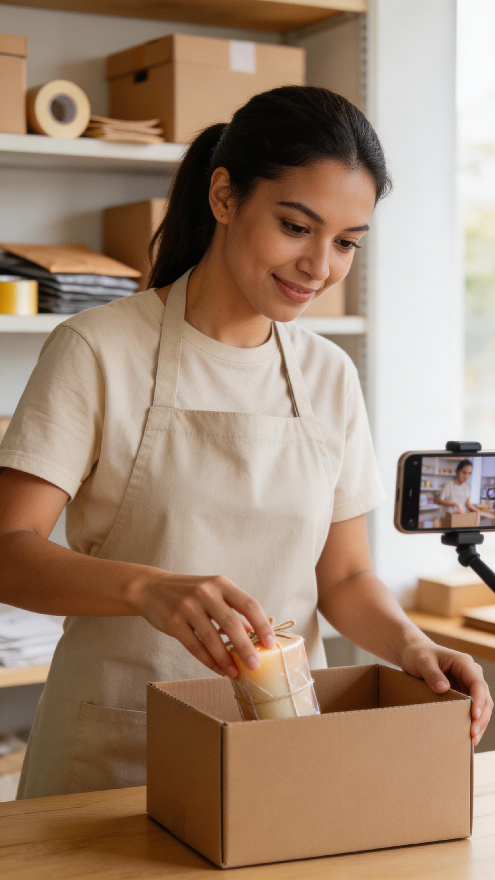 Half-body lifestyle shot of a Hispanic/Latina woman in her late-20s filming a “small business packing orders” clip, placing items into a box while the phone records. Outfit: apron, hair tied back. Background: bright workspace with shipping supplies, natural light, clean creator-documentary style. no captions, no writing, no text, no watermarks, no logos, no overlays