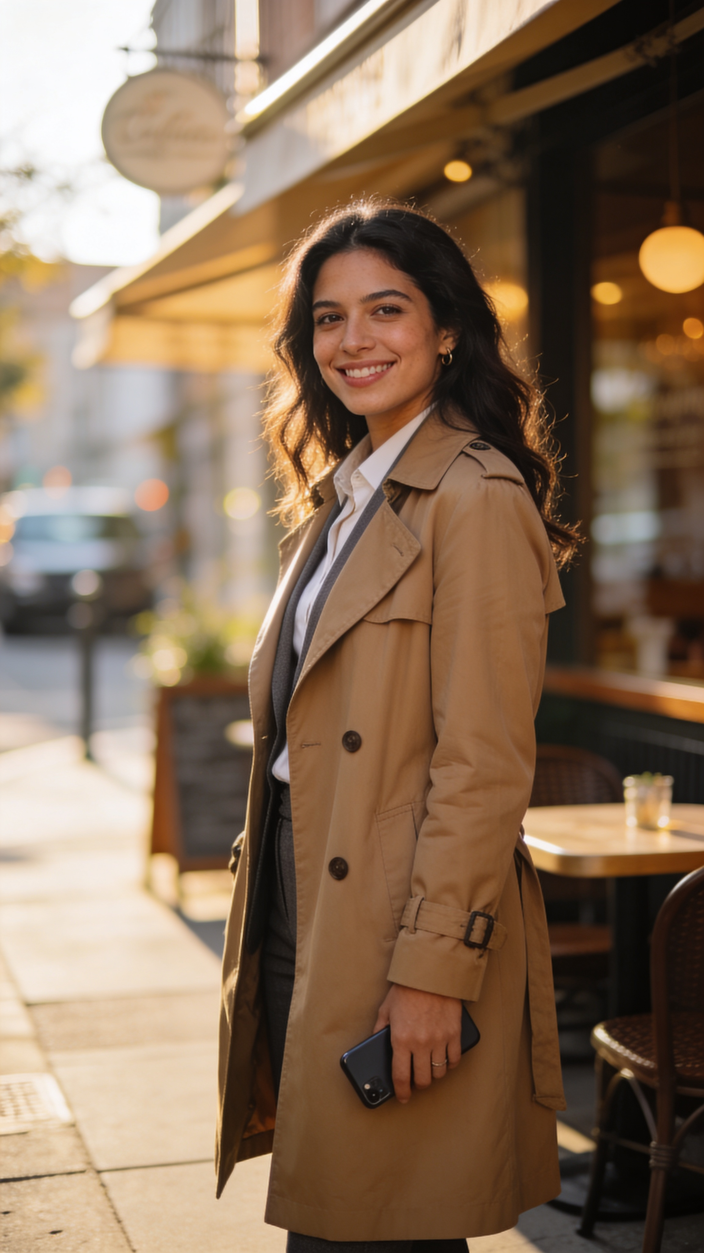 Outdoor lifestyle portrait of a Hispanic/Latina woman in her late 20s, 3/4 body shot on a city sidewalk near a café, wearing a tan trench coat over business attire. She looks at the camera with a confident, friendly smile, one hand holding a phone at her side. Soft morning light and clean bokeh background, no text, no watermarks, no logos, no overlays, no captions, no writing