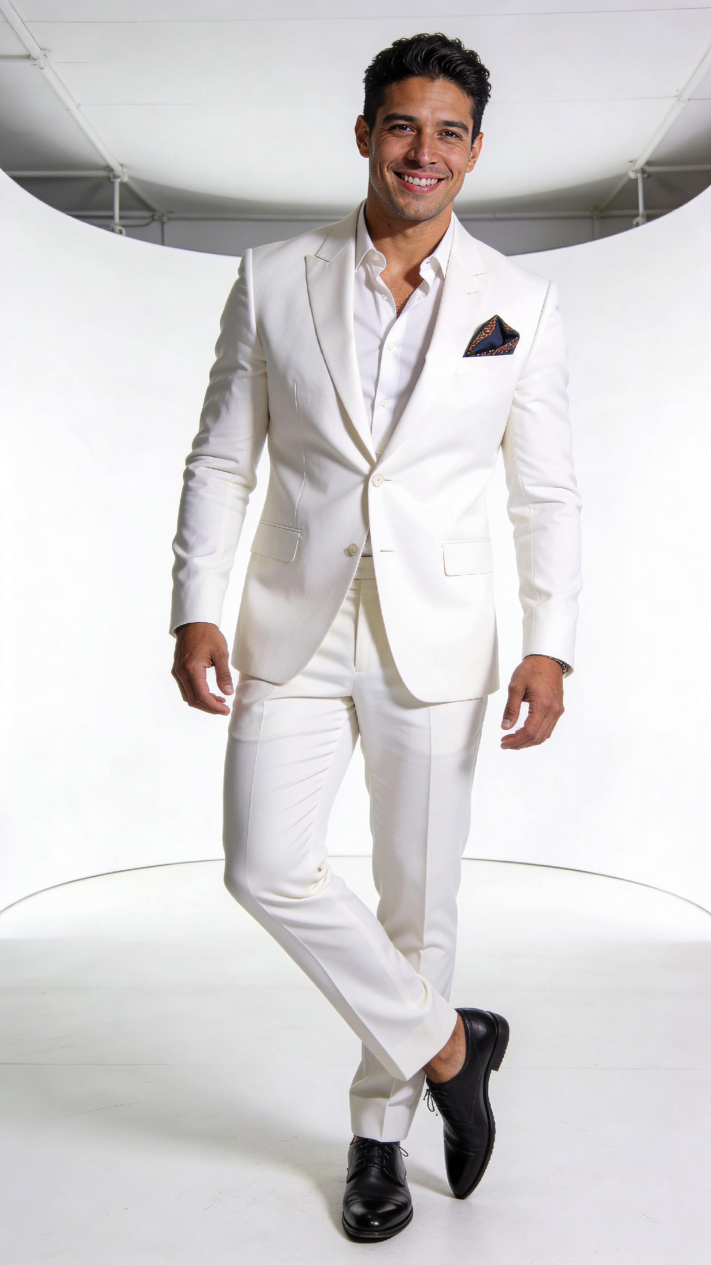 Studio full-body portrait of a Hispanic/Latino man in his 30s in a white cyclorama, wearing a modern suit with a pocket square. He stands in a confident fashion pose, one foot forward, relaxed smile. Bright, even lighting with light edge highlights for clean glamour photos for profile. No captions, no writing, no text elements anywhere, no text, no watermarks, no logos, no overlays