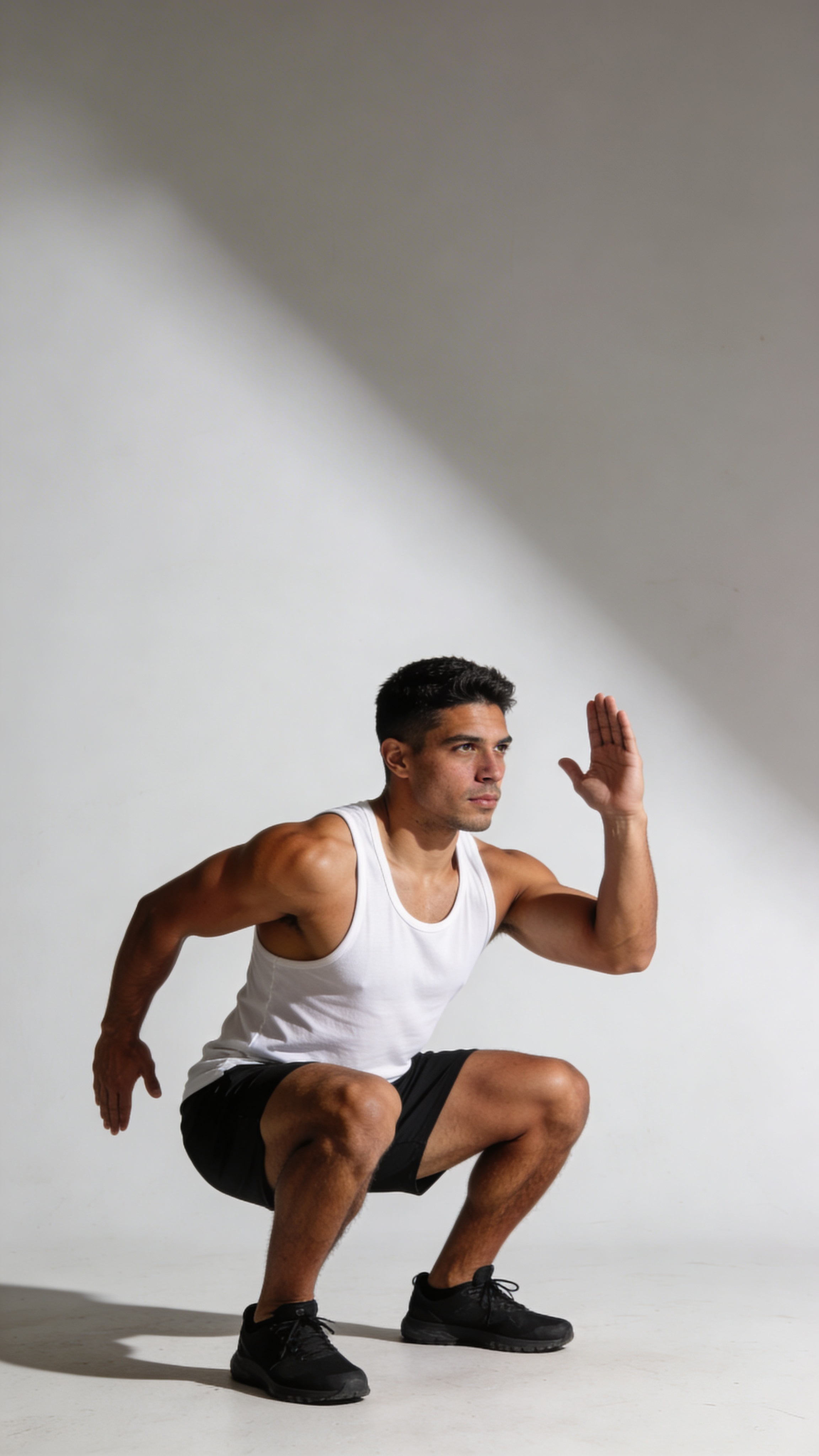 Full-body portrait of a Hispanic/Latino man in his early 30s mid-squat pose without weight (form-focused), confident look. Wearing a white tank and black shorts. Setting: seamless studio backdrop with crisp key light and soft shadow. Clean, professional fitness photoshoot lighting. Ensure no captions, no writing anywhere; no text, no watermarks, no logos, no overlays