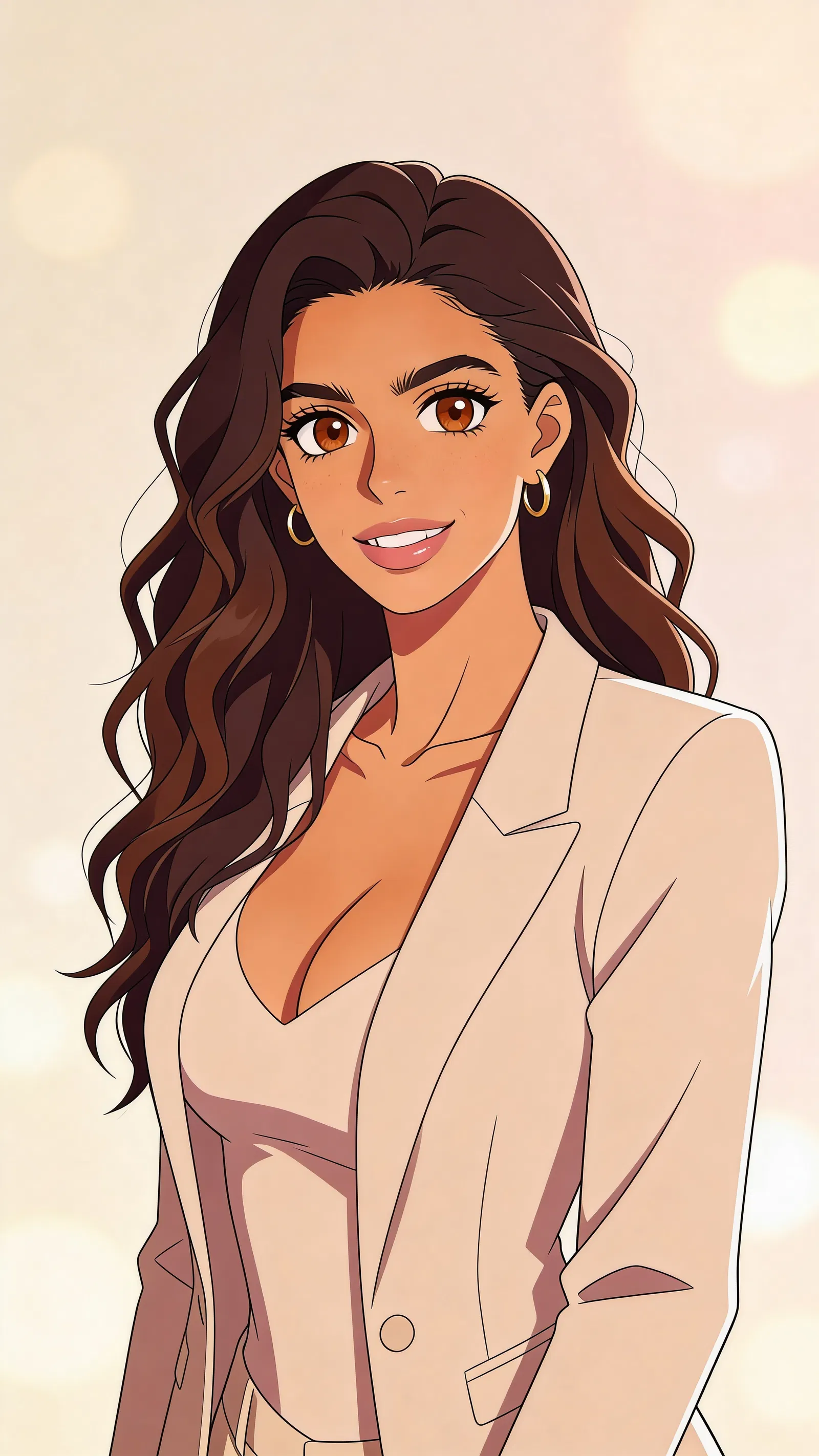 Single photograph of exactly the same person as the reference image(s), consistent identity realistic photograph, female person, 27 years old, brown eyes, dark-brown hair color, wavy hair style, olive skin Hair color must stay dark-brown. Keep hairstyle consistent (wavy). Do not change defining physical features. No wigs. No hats. Face unobscured. Headshot shot. Anime-style profile picture illustration of a young woman with olive skin, dark-brown long wavy hair, and brown eyes, slim build. Shoulder-up avatar composition for circular crop, warm confident smile, clean studio background in soft beige with gentle bokeh. Wearing a modern blazer over a simple top, crisp anime linework and smooth shading with bright eye highlights, no captions, no writing, no text, no watermarks, no logos, no overlays