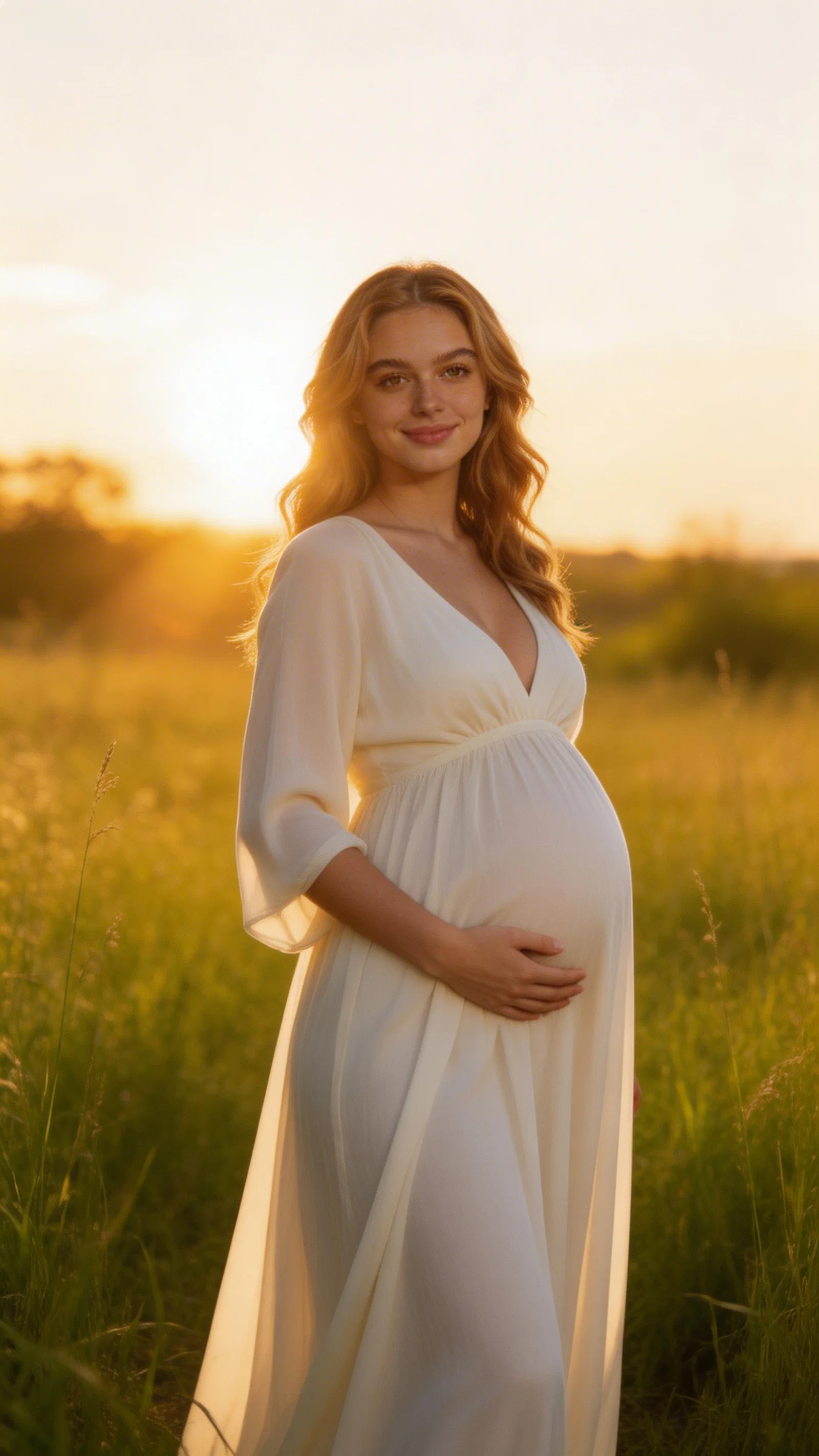 Single photograph of exactly the same person as the reference image(s), consistent identity grounded realistic photograph with high-detail skin texture, visible pores and natural imperfections, female person, 23 years old, light-brown eyes, light-brown hair color, wavy hair style, cream skin Hair color must stay light-brown. Keep hairstyle consistent (wavy). Do not change defining physical features. No wigs. No hats. Face unobscured. Full-body shot. Golden-hour outdoor portrait of the same cream-skinned pregnant woman in a flowing white maternity gown, standing in tall grass with warm sun flare behind her. Calm joyful smile, hair naturally wavy, cinematic backlight, professional bokeh, no text, no watermarks, no logos, no overlays