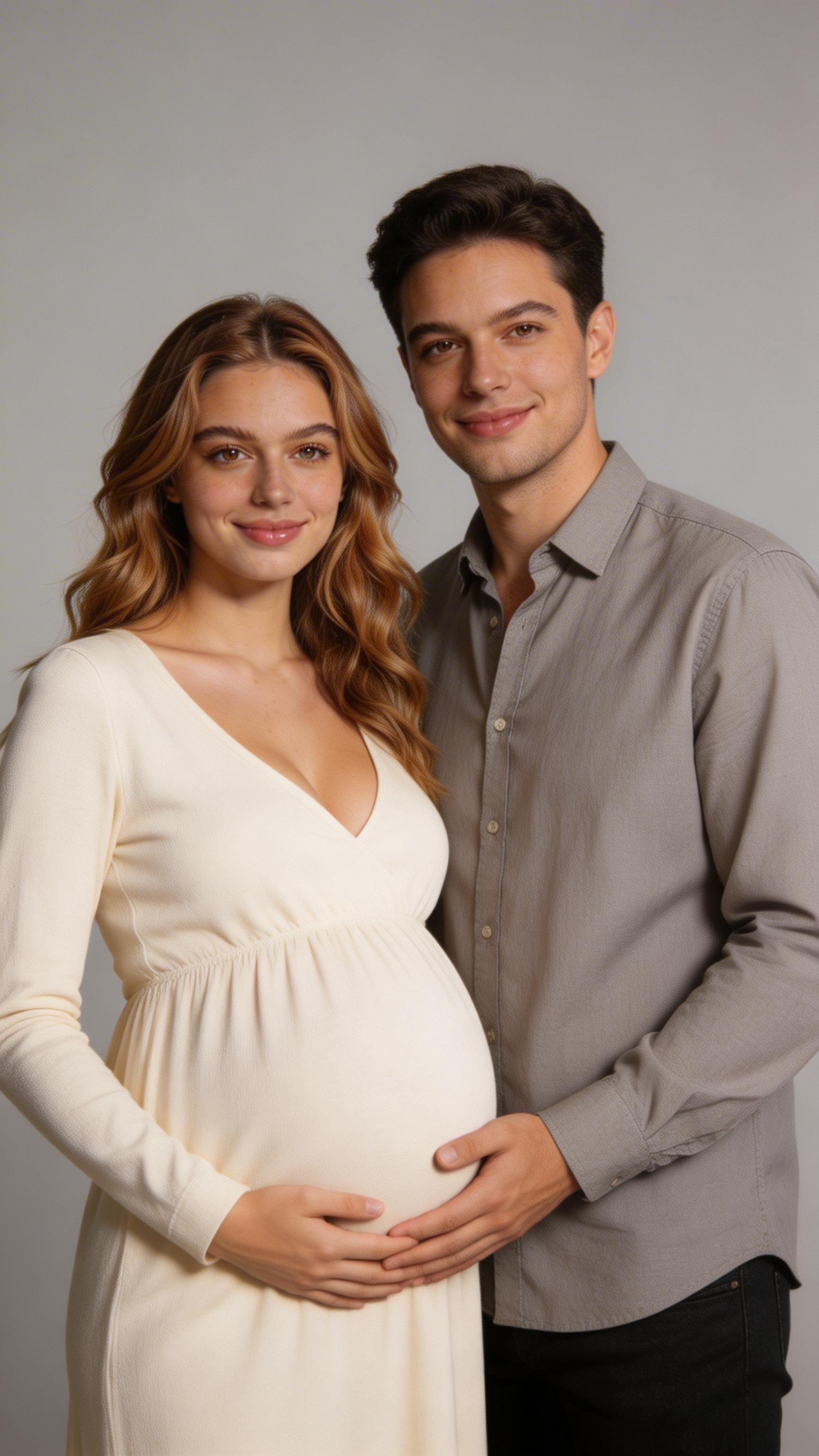 Single photograph of exactly the same person as the reference image(s), consistent identity grounded realistic photograph with high-detail skin texture, visible pores and natural imperfections, female person, 23 years old, light-brown eyes, light-brown hair color, wavy hair style, cream skin Hair color must stay light-brown. Keep hairstyle consistent (wavy). Do not change defining physical features. No wigs. No hats. Face unobscured. Environmental shot. Studio couple maternity portrait with the same woman and her partner against a light-gray seamless backdrop. She wears a fitted cream dress; partner wears a neutral button-down. They smile at camera, hands together on belly, soft even studio lighting, timeless composition; no captions, no writing; no text, no watermarks, no logos, no overlays