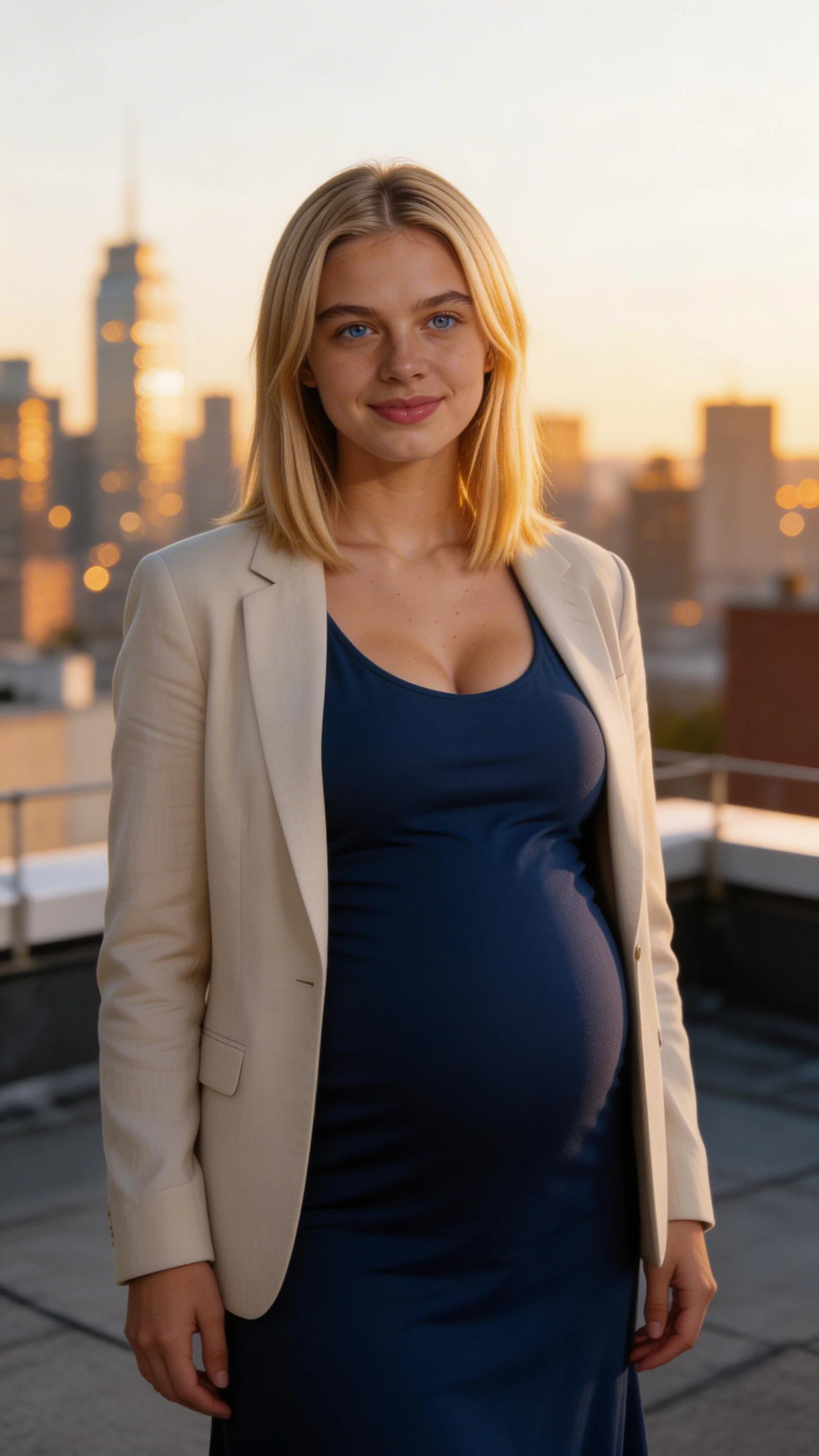Single photograph of exactly the same person as the reference image(s), consistent identity grounded realistic photograph with high-detail skin texture, visible pores and natural imperfections, female person, 24 years old, light-blue eyes, blonde hair color, straight hair style, ivory skin Hair color must stay blonde. Keep hairstyle consistent (straight). Do not change defining physical features. No wigs. No hats. Face unobscured. Environmental shot. City rooftop sunset maternity portrait of the same woman wearing a navy maternity dress and light blazer. Three-quarter body, confident smile, skyline bokeh, warm rim light with soft fill for natural skin tones; no captions, no writing; no text, no watermarks, no logos, no overlays